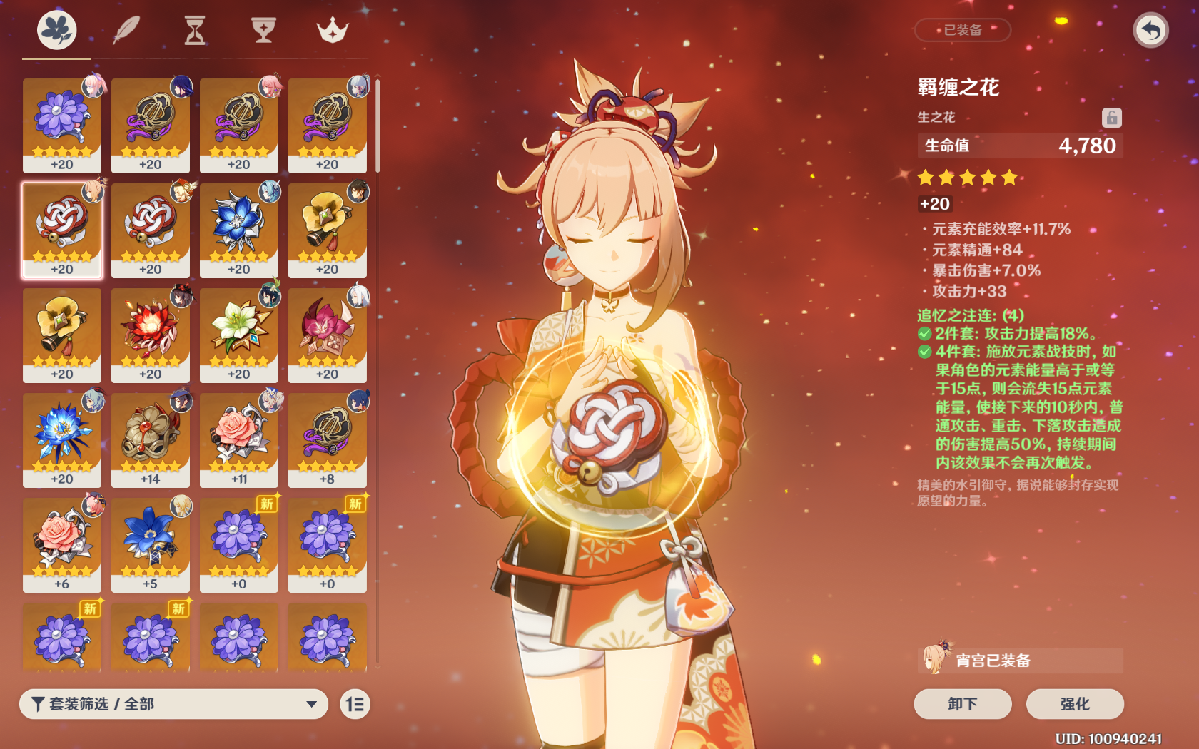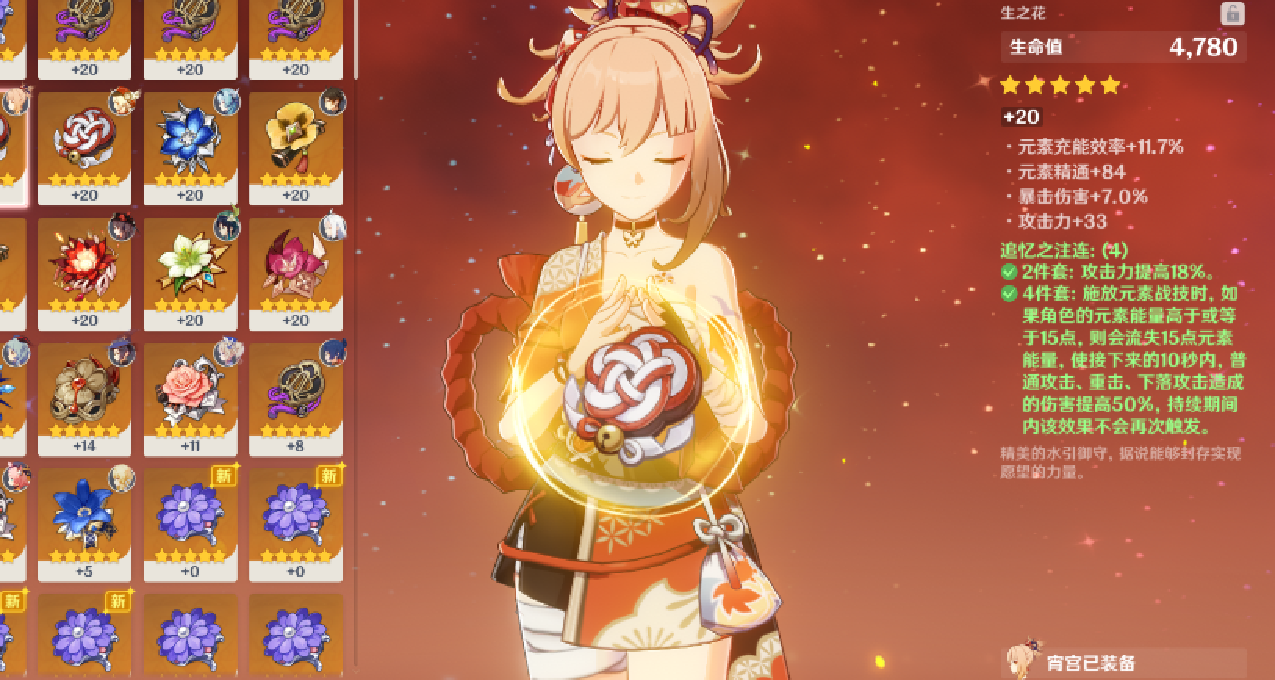 套装推荐:追忆套推荐度大于余响套,虽然余响套的70%增伤看上去很美好,但它需要概率触发,这就造成了普攻时的伤害加成不稳定,而宵宫是属于多段平a,伤害逐渐增加的,越后面伤害越高,追忆套能够稳定的造成每一击50%增伤,总收益是大于余响的。