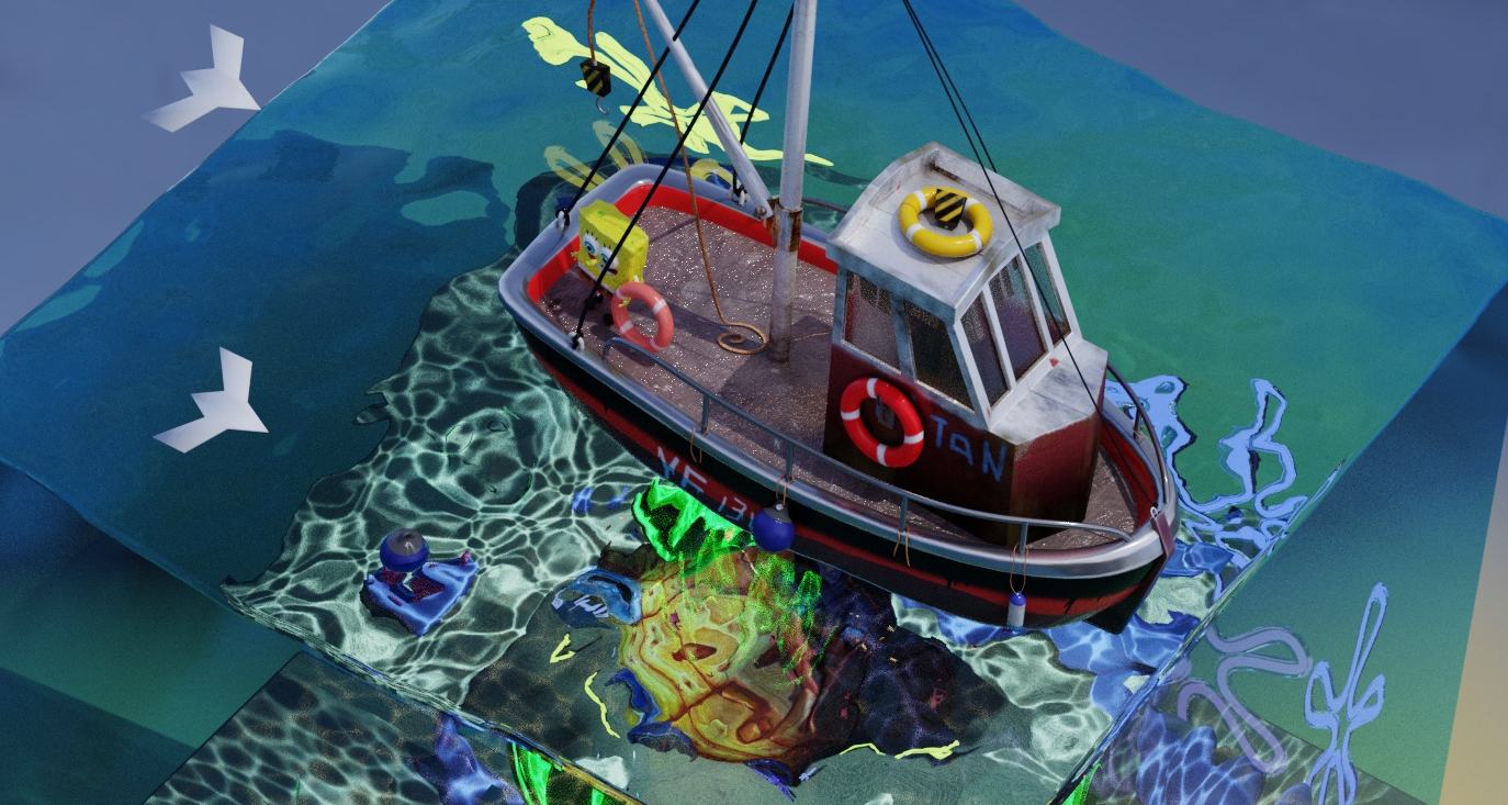 场景搭建:工作量很大,尤其是建模,从0到1的过程很艰辛。搜集了各种参考图,包括海绵宝宝,海绵宝宝的菠萝屋以及船体。
