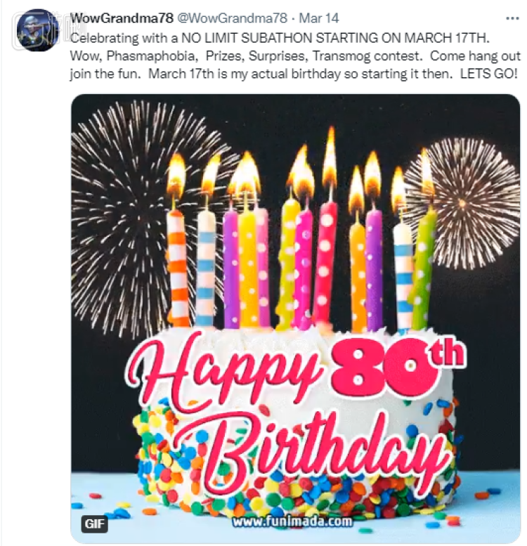 上个月14日,WowGrandma78在推上发布了一条消息,她宣布自己将从17日那天,也就是生日那天开始,用一场直播马拉松来庆生。