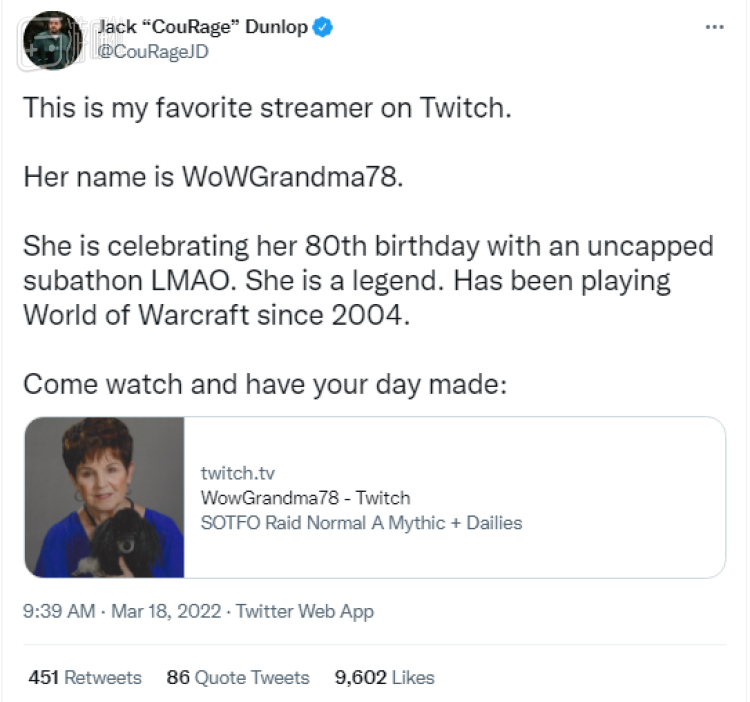 这些关注最初来自于她某些身份不简单的粉丝——油管360万粉的射击游戏博主CouRage在马拉松开始第一天,就在自己的社交账号上公开推荐了她的频道,他称WowGrandma78是自己最喜欢的博主,还和自己的粉丝称赞其为“传奇”。