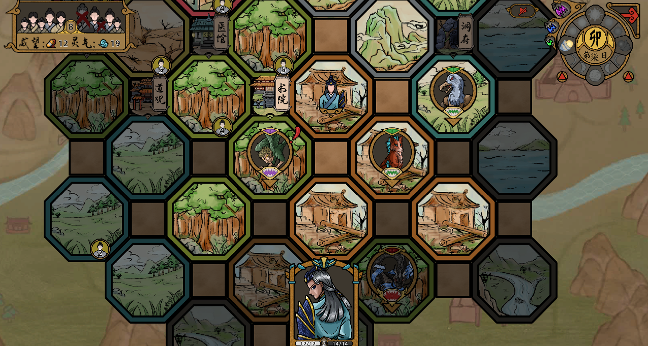 作为一款战棋风格的游戏,笔者认为最应该强调的,其实是随机探索的特性,即可通关策略绕开对应的怪物,先行探索收获,增强实力自己选择挑战对手。在这款游戏中,这样的探索内容比较不错,怪物并非进入攻击范围就会攻击你,而是需要你点击怪物冲上去进行二次触发,才能进入战斗状态。游戏的胜利条件除了上面说到的,还有一点就是需要在十日内消灭妖兽BOSS,这个游戏中存在一个妖兽BOSS,在没消灭之前,会在每一日投放大量怪物屠杀人口。你需要在除魔卫道的同时,增进实力,最终消灭BOSS,那你就需要在地图中多探索,寻找各种机缘、增强实力的方法等。值得一提的是,这款游戏的难度设计,采用了爬塔的模式,即你随着日期不断增加,你面对的怪物实力会越来越强。你需要自我更新伤害、阴阳气上限,这样才能在争斗中更容易生存下去。