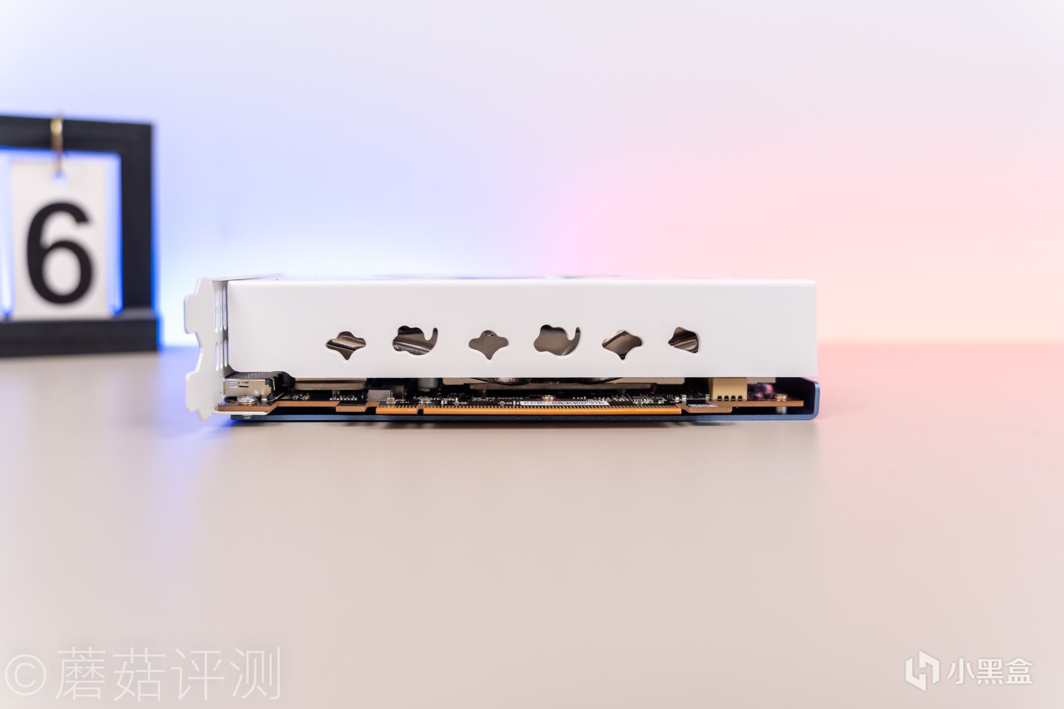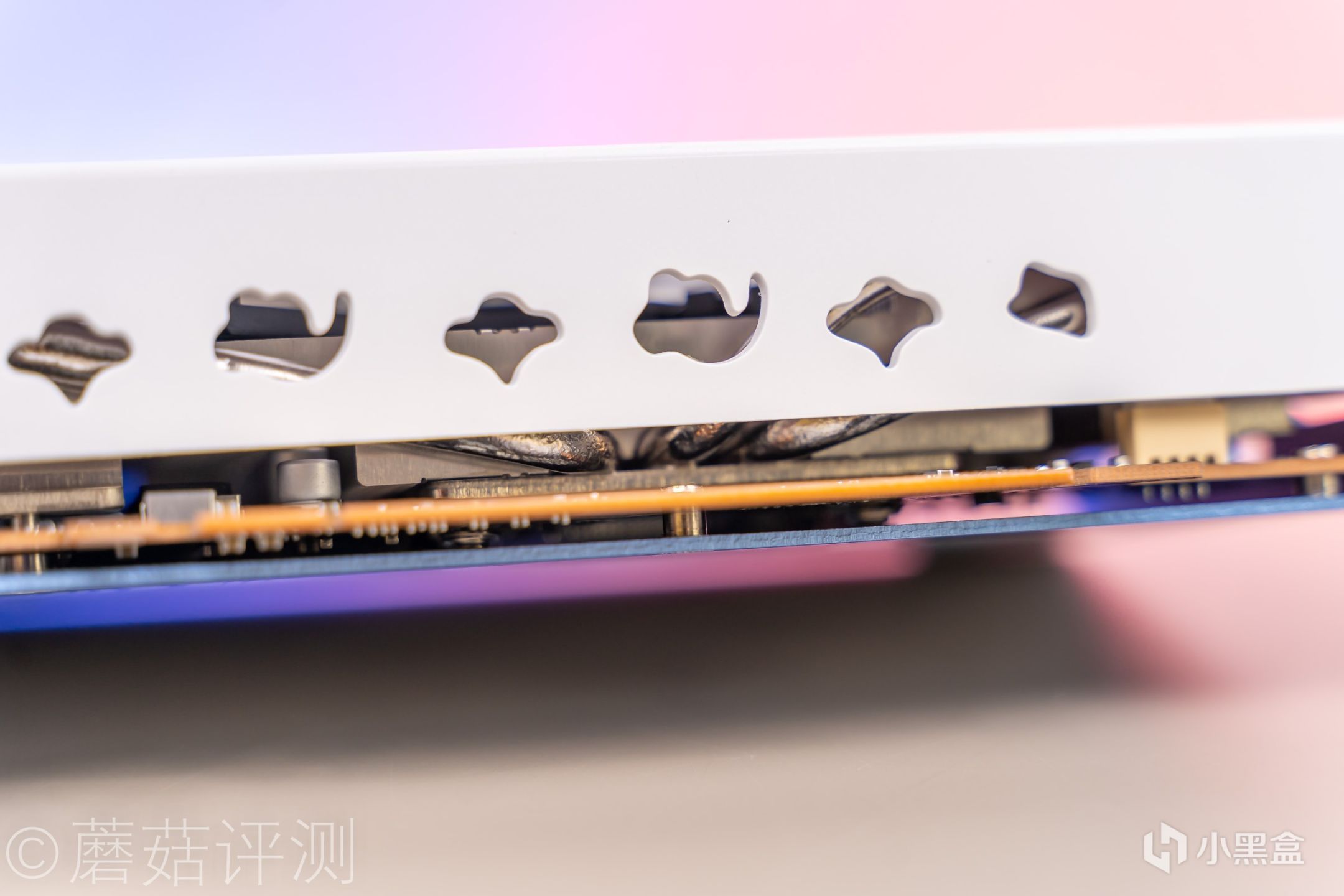 ▼显卡底部,风扇罩部分也有延伸,可以完全将显卡的散热模组保护起来,另外,侧裙部分还有好看的镂空设计,既方便气流通过,还能起到很好的装饰作用。