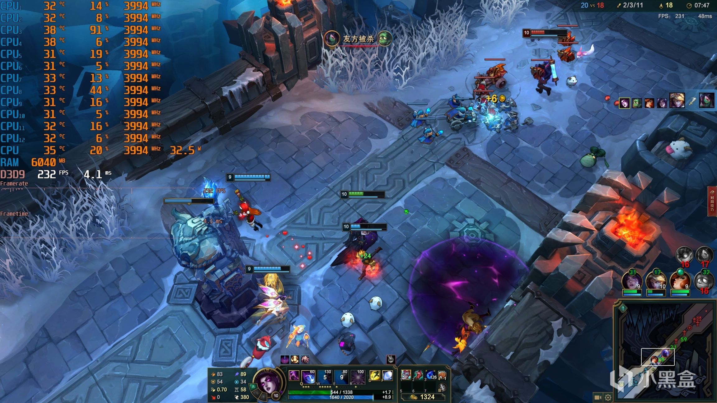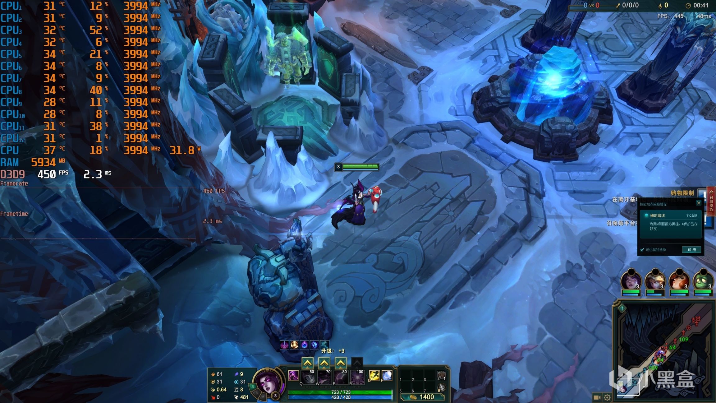 ▼游戏实测,LOL大乱斗模式,2K分辨率,全极高画质,泉水游戏帧数在450帧左右,挺流畅的。
