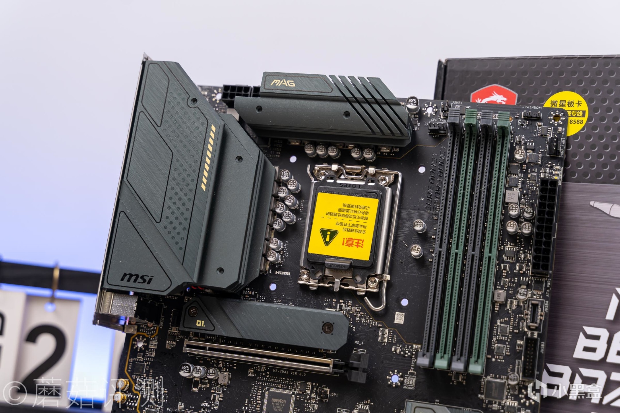 ▼主板的外观还是挺漂亮的,正面覆盖有大面积的金属散热片,且都涂成了墨绿色,看着很有质感。