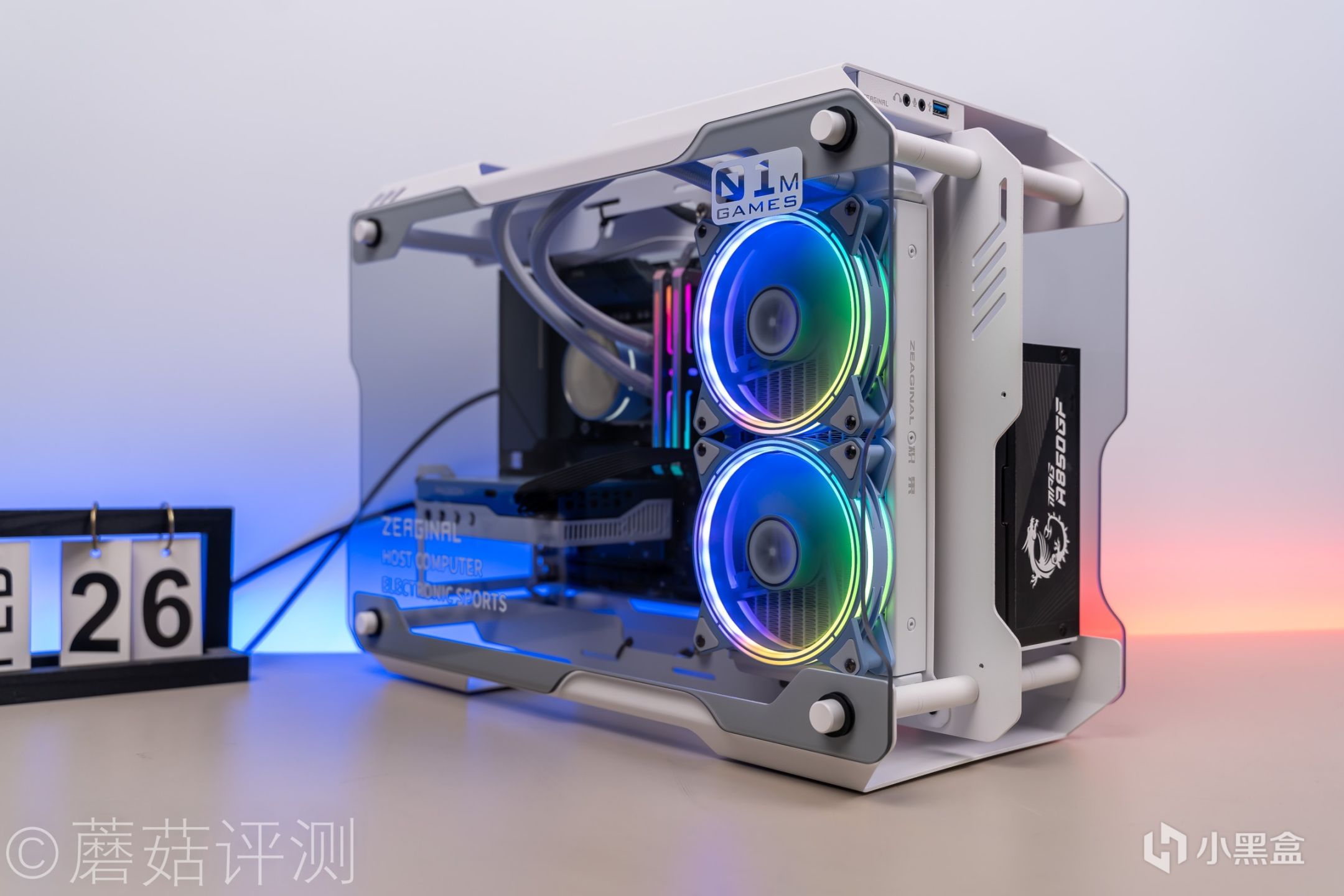 ▼稍稍靠后的角度,水冷排风扇的灯效还会在机箱侧透玻璃上有倒影。不过这个电源有些普通了,如果换个白色的电源,电源散热风扇也有灯效,就更漂亮了。