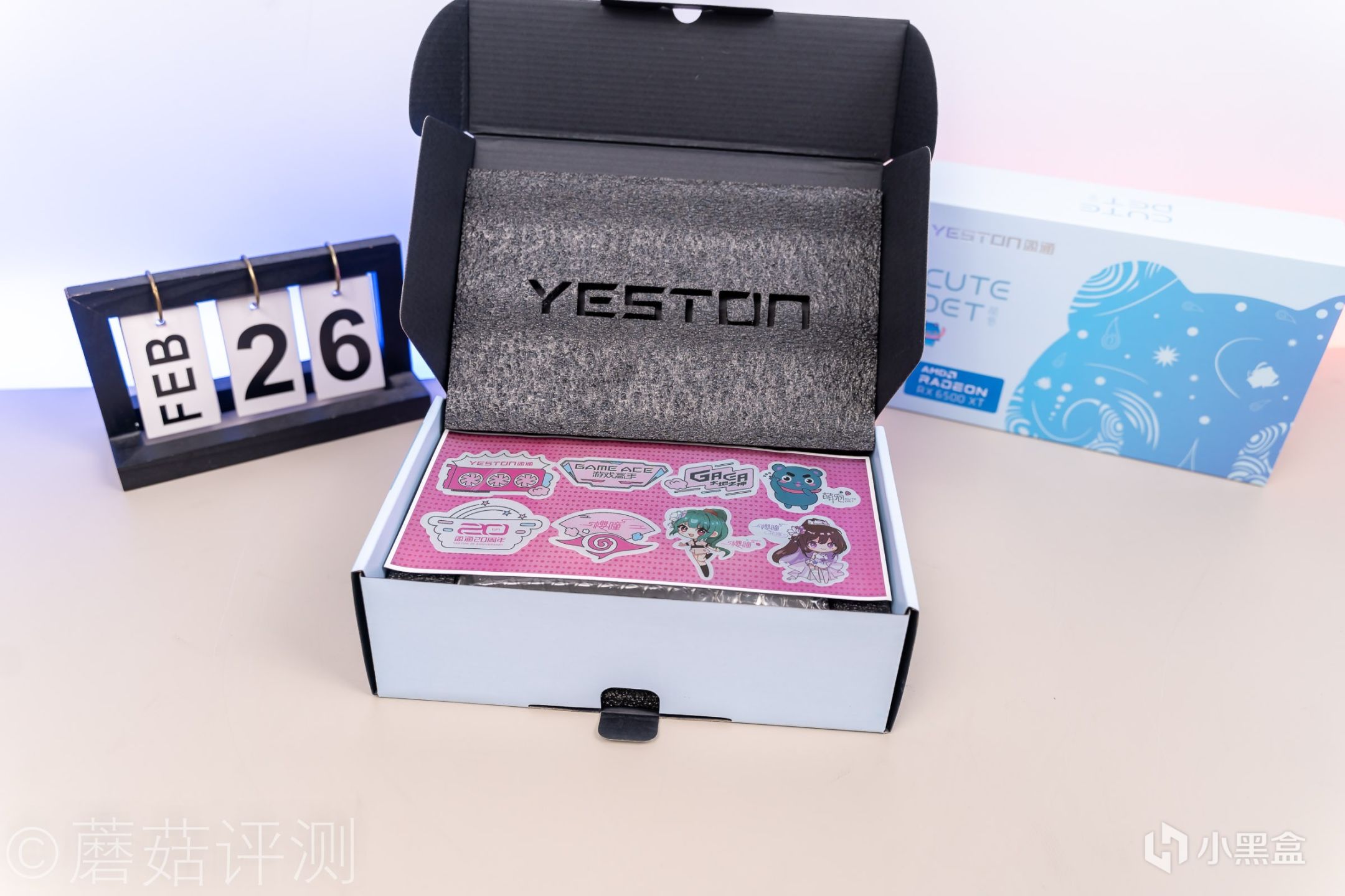 ▼打开纸箱,内部的减震泡沫都有盈通的LOGO,细节很到位。除了显卡之外,还标配了一张贴纸。