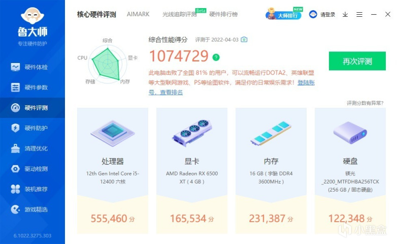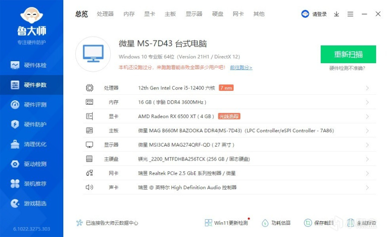▼整机配置一览,处理器是12400,主板是微星的B660M火箭炮,显卡是盈通的萌宠RX6500XT。