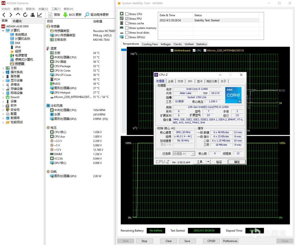 ▼最后单烤FPU测试,12400处理器全核心睿频4.0GHz,温度51℃左右。