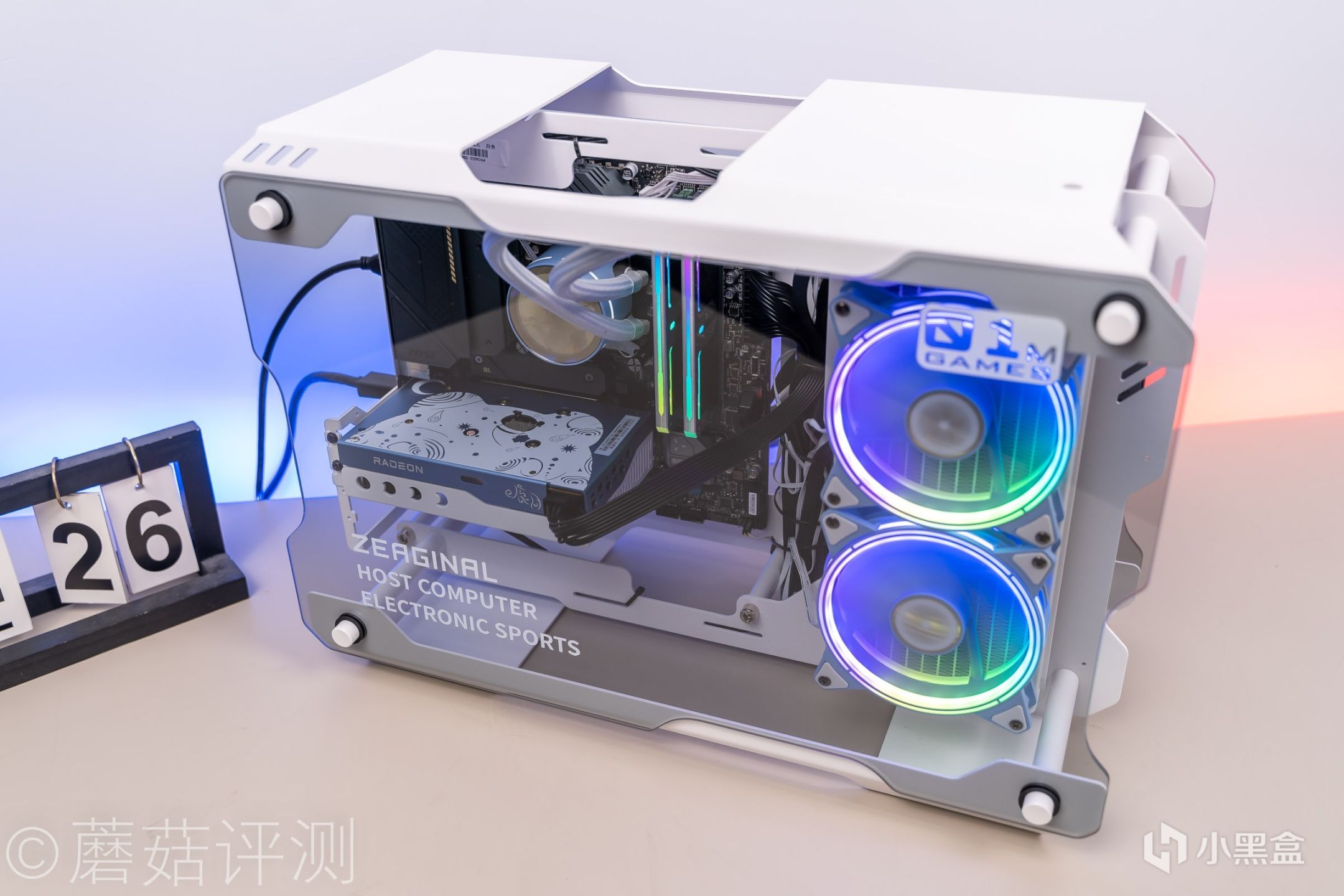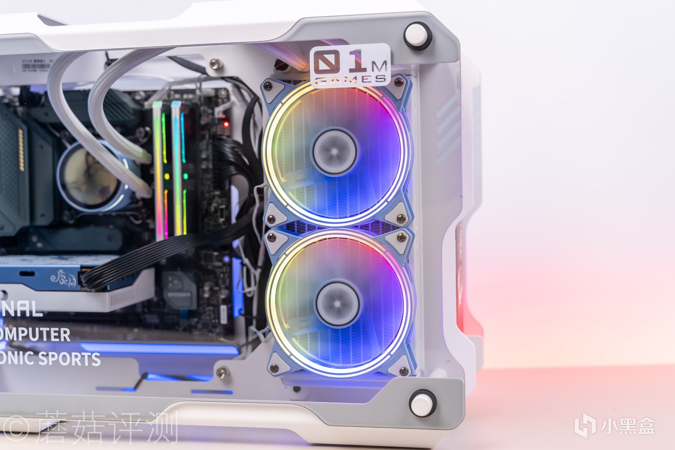 ▼炽果01M葡萄罐儿机箱的侧面侧透玻璃有熏灰处理,会稍稍压暗一些机箱内部的灯效,让整体的效果更加精致。炽果樱瞳花嫁240一体式水冷水冷排风扇的侧面也有RGB灯带,从水冷的侧面看过去也很漂亮。冷排风扇正面的RGB灯圈有两圈,内外圈还有不同的外观设计。