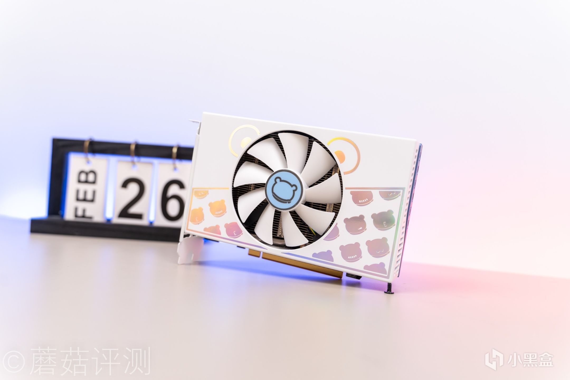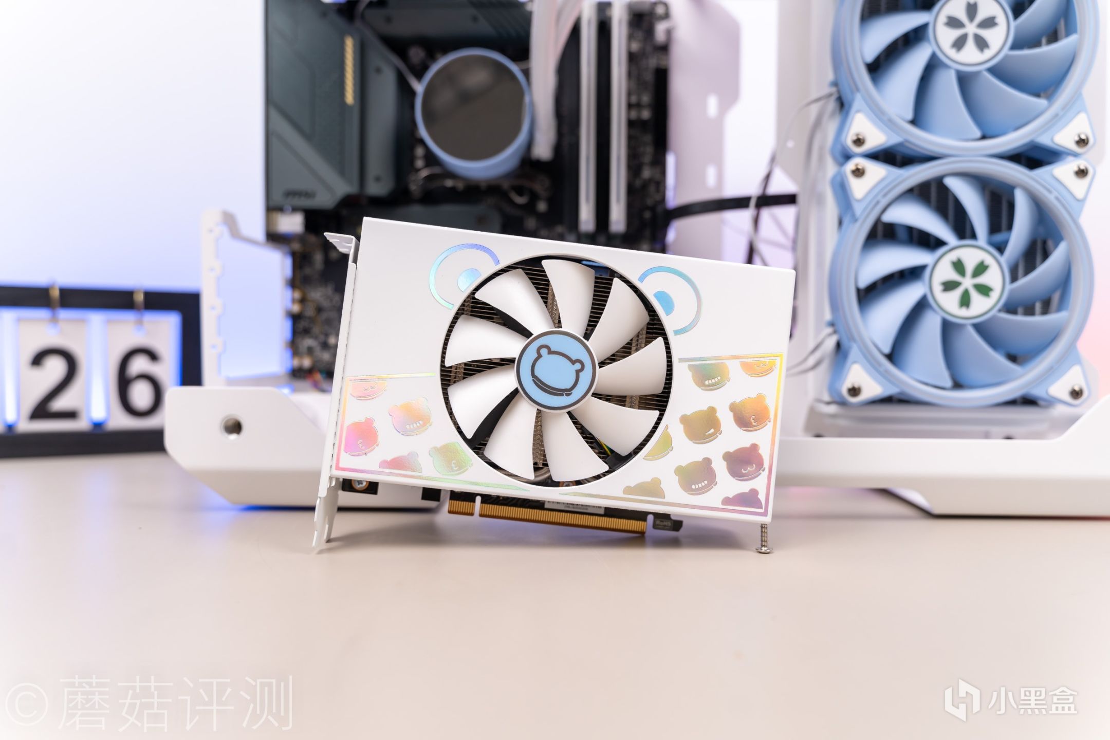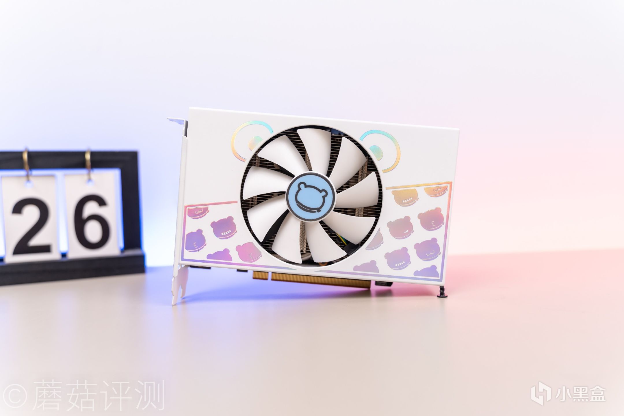 ▼显卡非常小巧,单风扇设计。外观非常漂亮,正面采用了白色的风扇罩,上面贴有好看的贴纸。
