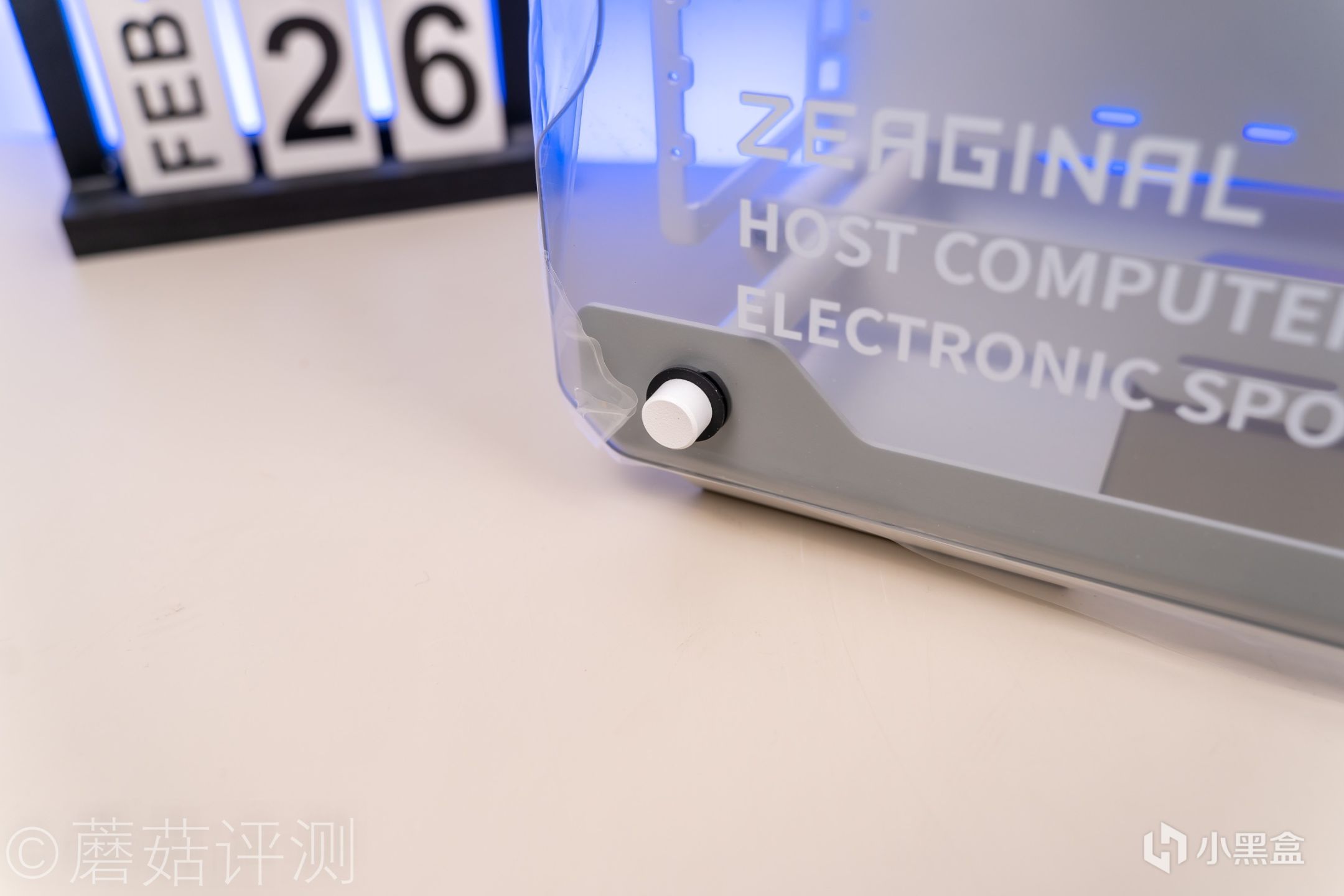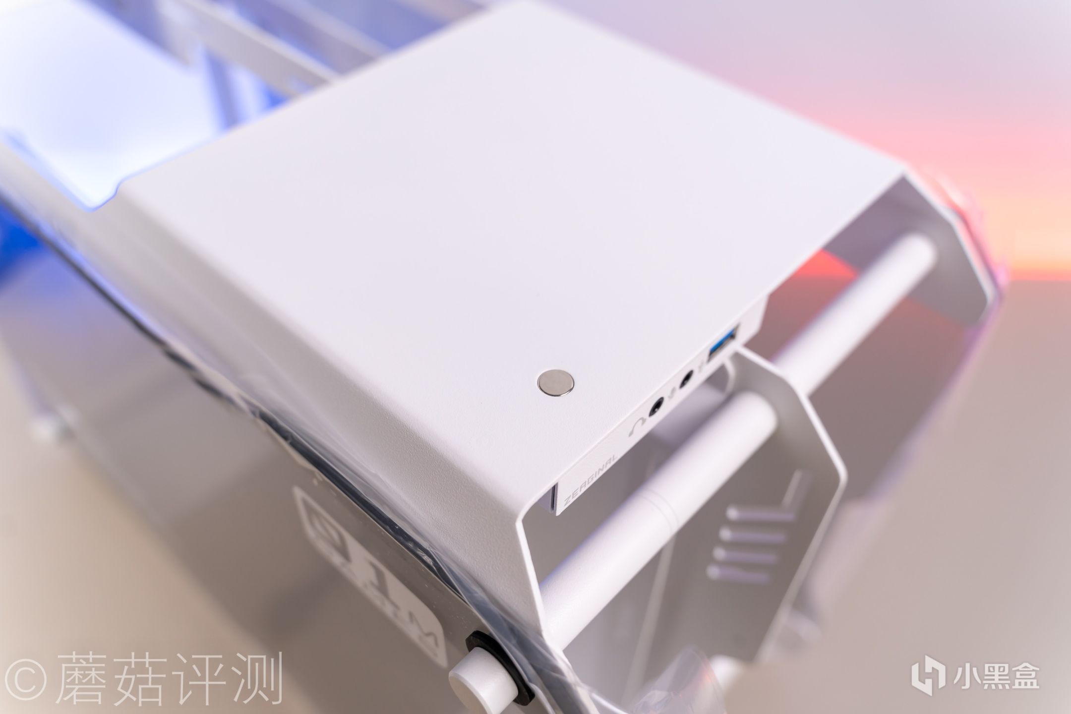 ▼机箱侧面侧透玻璃的固定件,一个铝合金的白色螺丝,螺丝很粗壮,徒手可以拧动。和侧透玻璃的接触部分有橡胶垫,可以有效的保护侧透玻璃。
