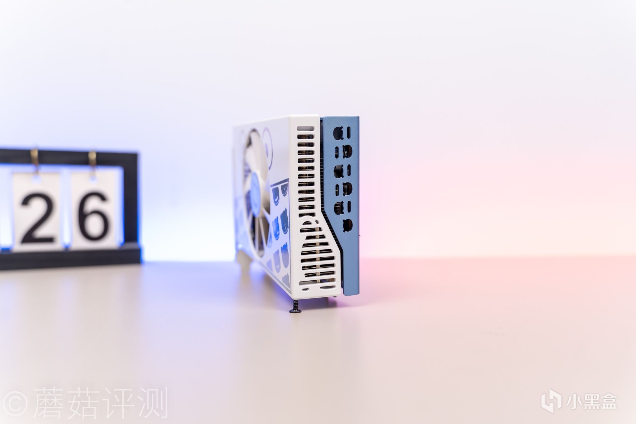 ▼显卡顶部也很精致,显卡白色的风扇罩和蓝色的金属显卡背板互相延伸,将显卡完全包裹。另外,显卡顶部还有一个显卡BIOS切换开关,可以在默频和超频两种模式中切换。