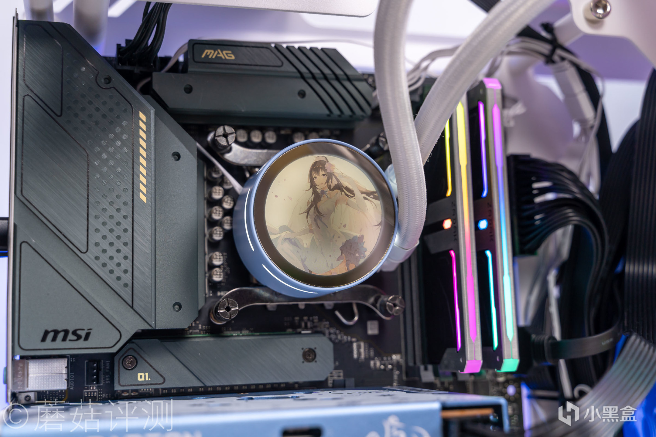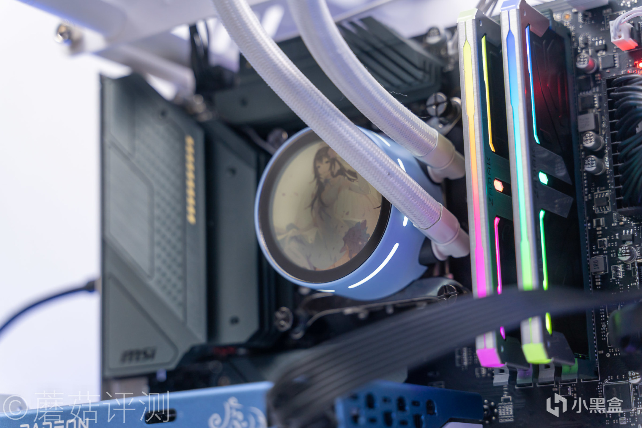 ▼另外,水冷头顶部的这个涂装设计有压暗处理,正常开机的时候,水冷头顶部的图像看着很清晰,但是不刺眼。水冷头正面是镜面设计的,稍微侧过一些,光影就消失了,樱瞳花嫁的形象更加清晰。