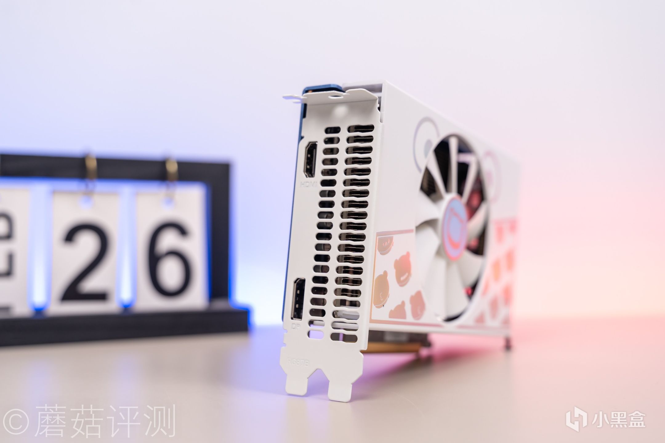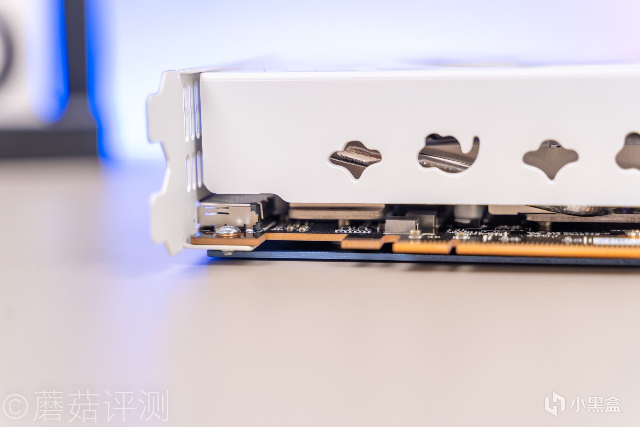 ▼显卡尾部,PCIe挡板部分有白色的涂装,非常漂亮。视频输出接口有两个,一个DP接口,一个HDMI接口。