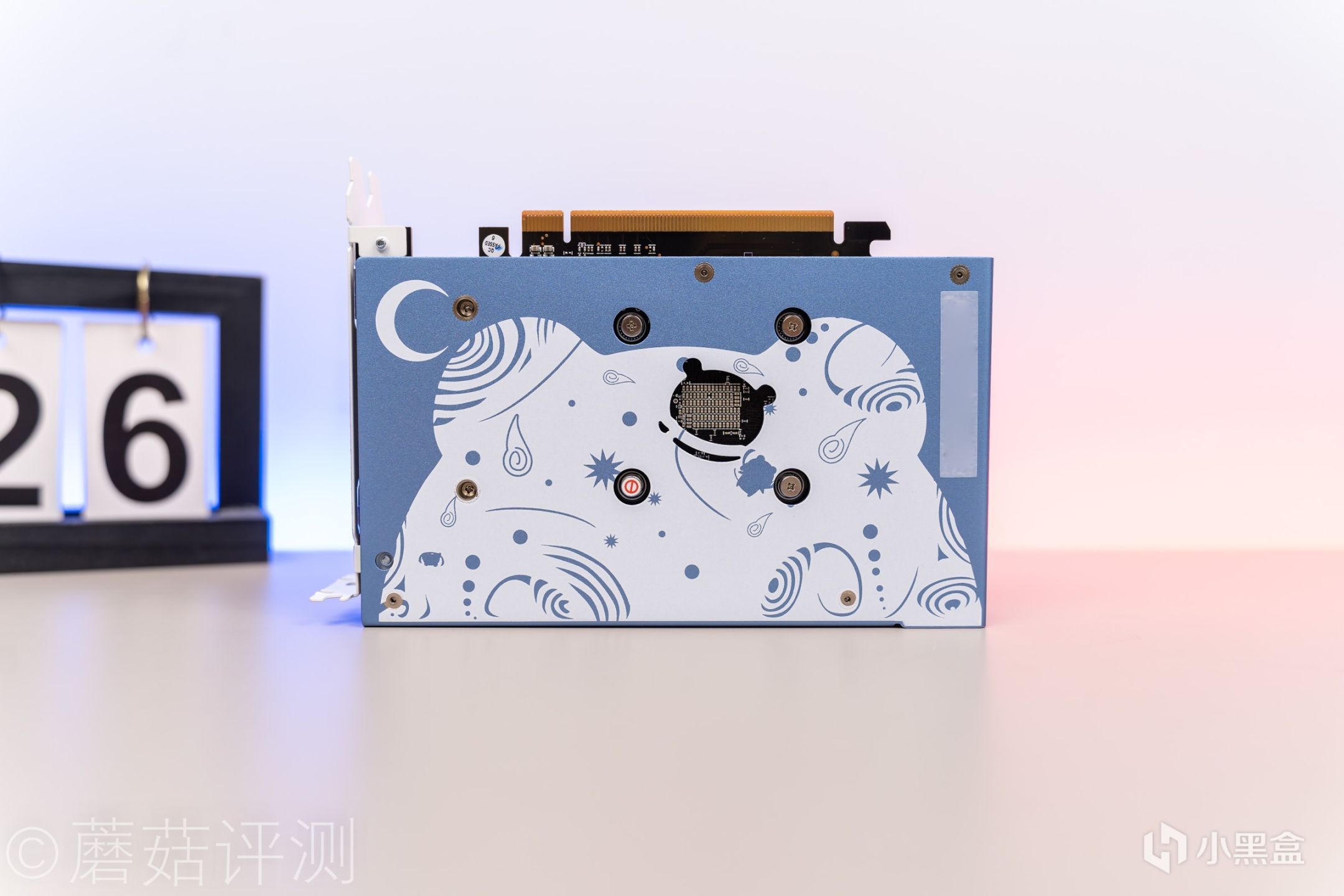 ▼显卡背板上的涂装很有意思,白色部分组成了一个头像,巧妙的利用了显卡核心背面的镂空和显卡散热模组的固定螺丝孔,设计感十足。