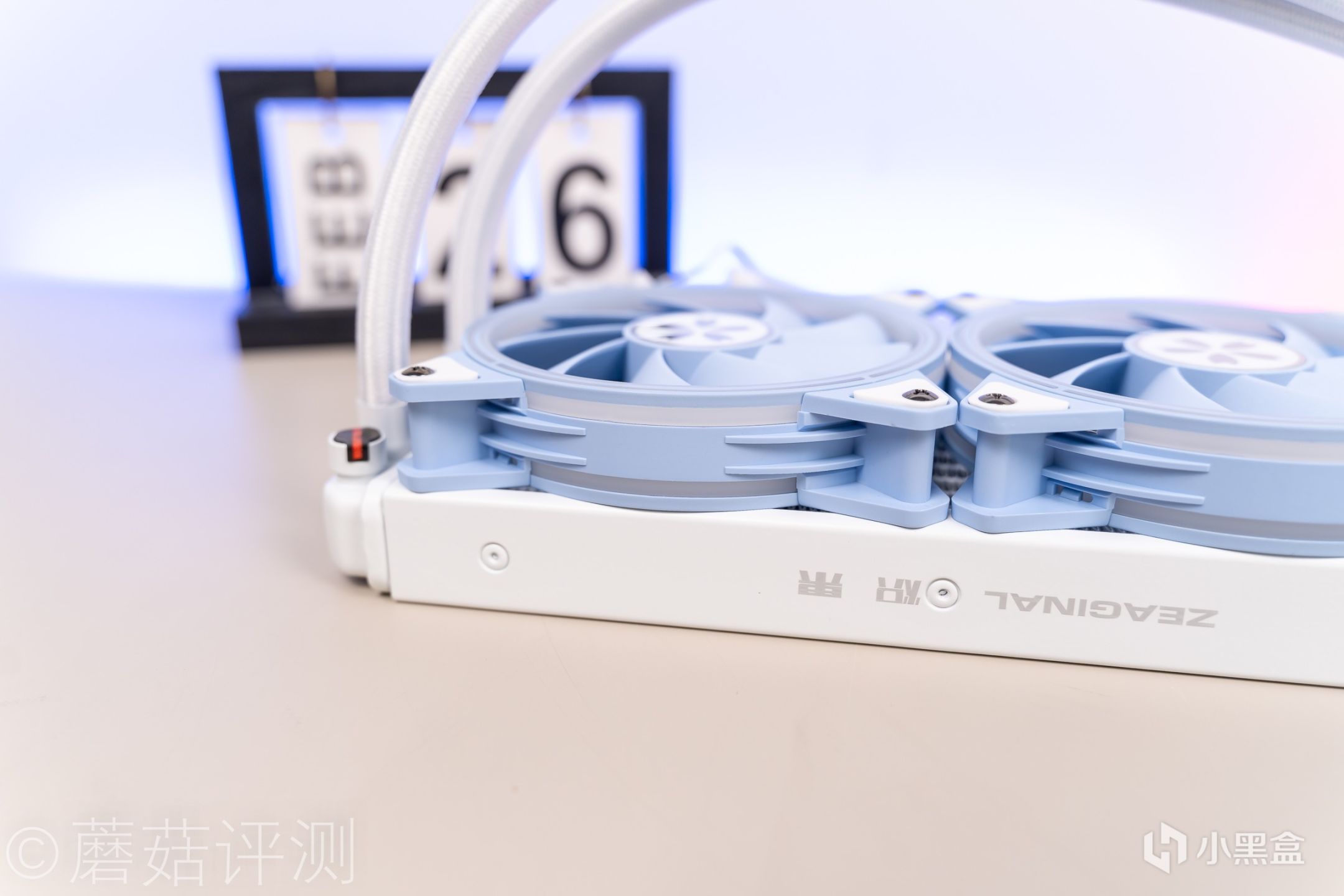 ▼冷排风扇是蓝色的,冷排就是白色的,冷排侧面有炽果的LOGO,看着很精致。