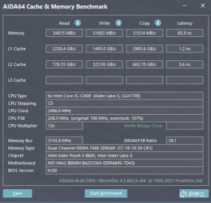 ▼简单跑个测试,读取55000MB/s、写入52000MB/s、拷贝51500MB/s,延迟65.9ns,性能不错。