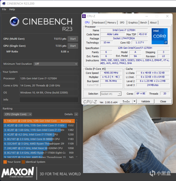 CPU性能直接使用Cinbench R23生产力项目来验证,这颗Core i7-12700H多核分数为15313 pts,单核分数为1725 pts,无论是单核还是多核性能,相较于上一代i7-11800H提升都是很明显的,不过由于定位是旗舰轻薄机型(厚度只有15.9mm),CPU分配功耗相对有限。