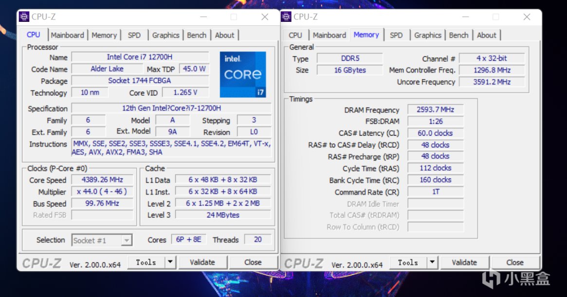 CPU-Z参数,搭载最新的十二代Core i7-12700H,拥有14核心20线程,包含6个P核和8个E核,最高4.7GHz睿频,相比Alienware X15 R1的i7-11800H来说性能大幅度增强是必须的,内存采用两根板载LP-DDR5 5200MHz组成双通道,相对拥有类似配置的Alienware M15 R7来说是采用DDR5 4800MHz,毕竟Alienware X15 R2是主打旗舰轻薄机型,定位是超过M15 R7的。