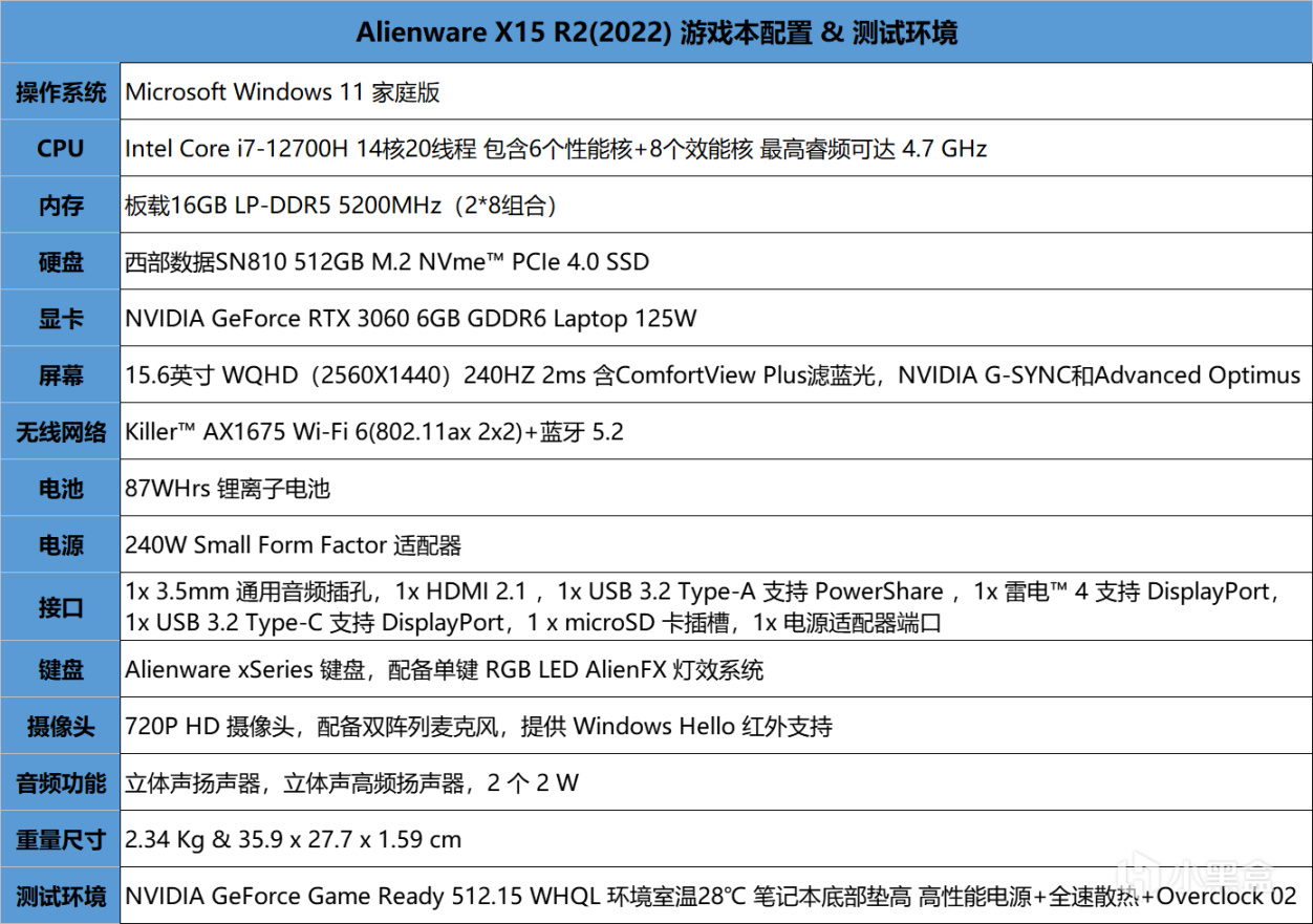 参数一览和测试环境,说到外星人游戏本,最大的特色之一就是可选配置丰富,就Alienware X15 R2而言,比如它可选不同的十二代酷睿处理器和NVIDIA RTX 30系显卡,适用于不同消费人群的各种需求。这款是Alienware X15 R2的基础版,CPU是炙手可热的Core i7-12700H,显卡是RTX 3060 6GB Laptop,16GB LP-DDR5双通道内存以及512GB PCIe 4.0 SSD,显示屏是拥有超高刷新率的2K@240HZ规格可选。