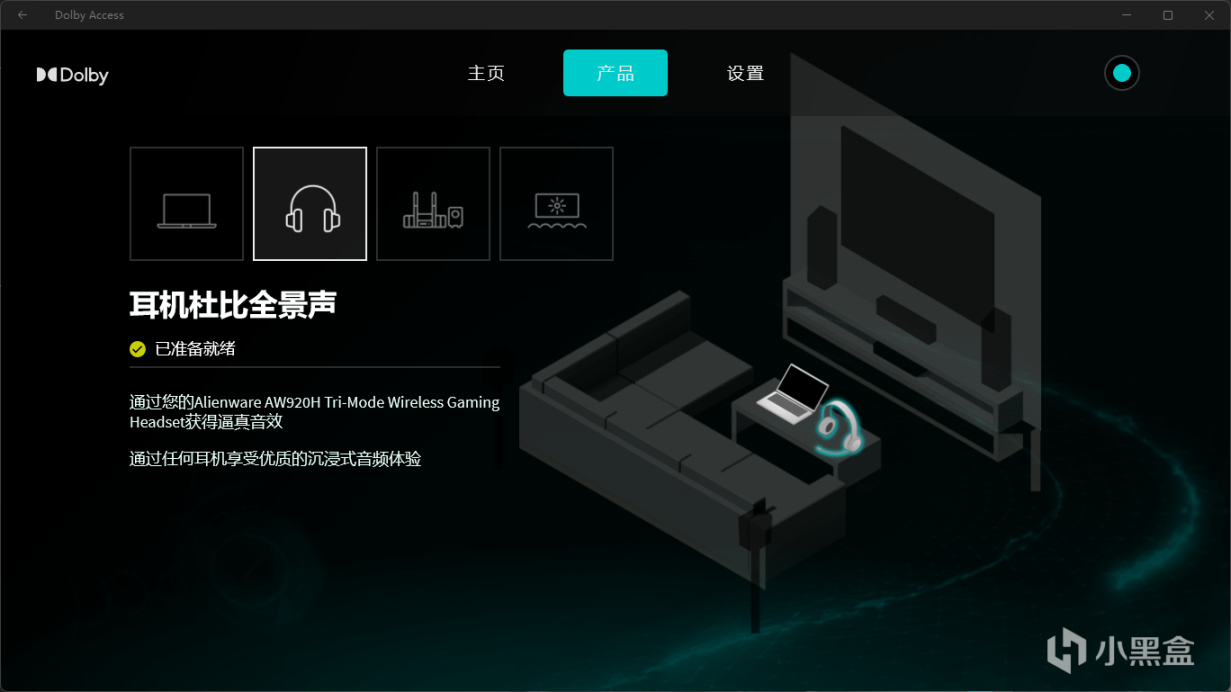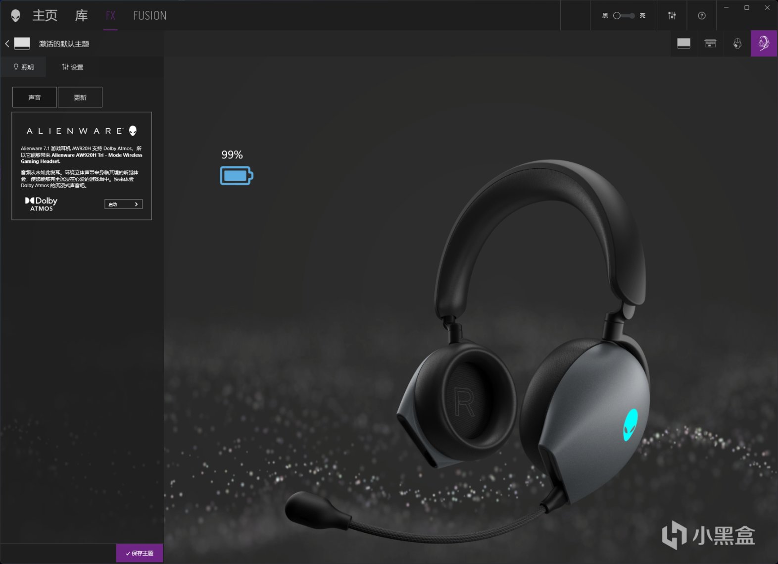 同样通过2.4 GHz无线连接耳机,AW920H的设置就简单许多,除了AlienFX RGB灯效和固件更新就是Dolby杜比全景声。2.4 GHz模式下关闭AlienFX RGB灯效、音量50%宣称达到30 小时,蓝牙则是55小时,充电方式也是快充。