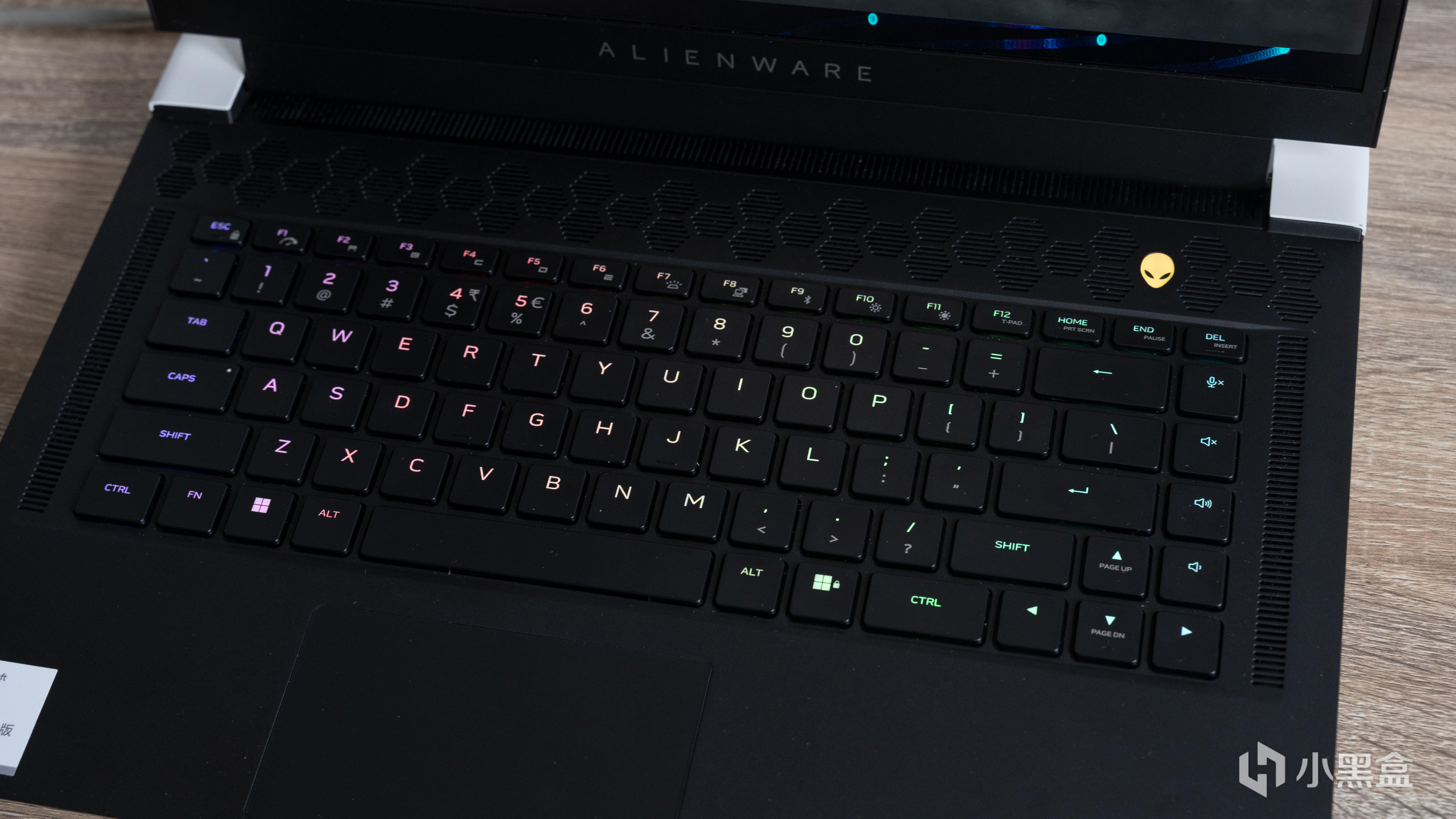 键盘区域,具有单键 RGB LED AlienFX 灯效,常见的1.5mm键程,右侧区域有多媒体键(麦克风静音和音量调节都很实用),方向键是全尺寸的好评,对于打字活或者某些游戏来说,不是全尺寸是很痛苦的。