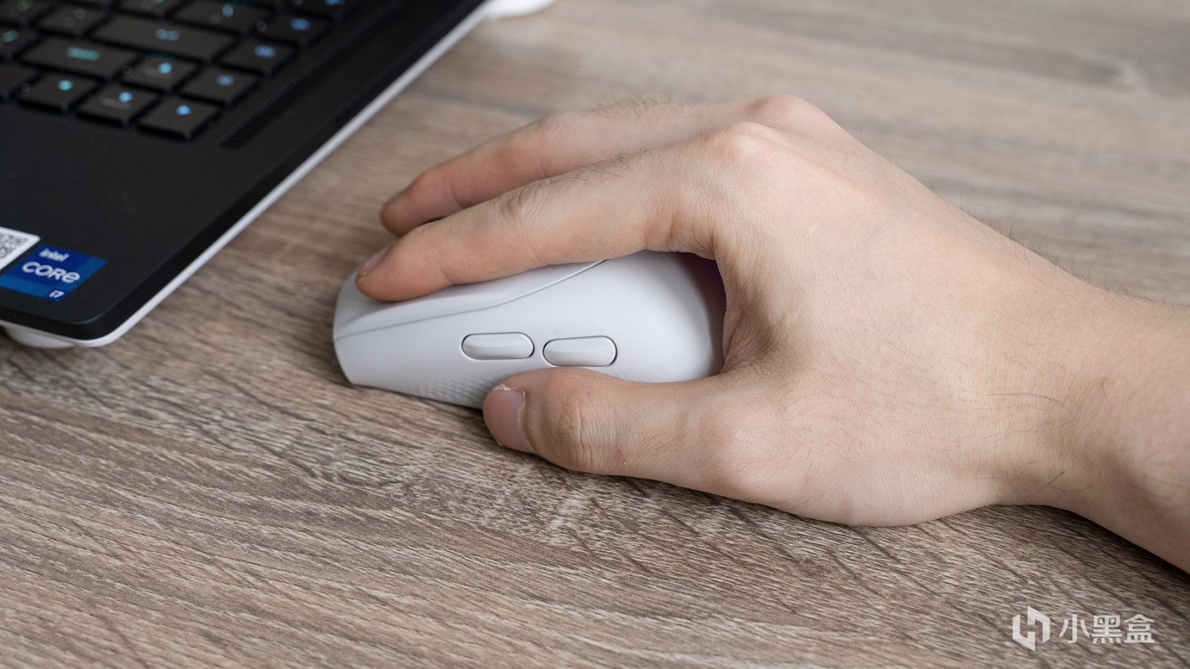 右侧视角,有两枚侧键,下方有纹理设计,放置大拇指的时候能防滑,左侧也是一样。