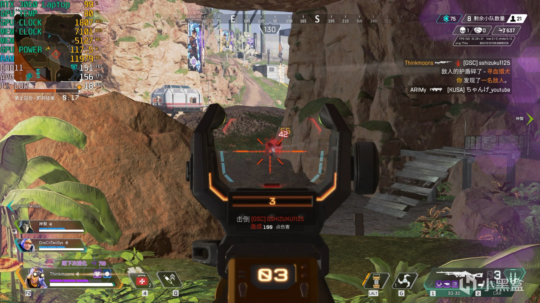 《APEX英雄》因为采用起源引擎优化还不错,这里使用两项最高,其他非常低的画面设置,一局诸王峡谷地图游玩下来,到了后期10分钟左右,平均帧数能有156fps,某些场景会接近200fps。