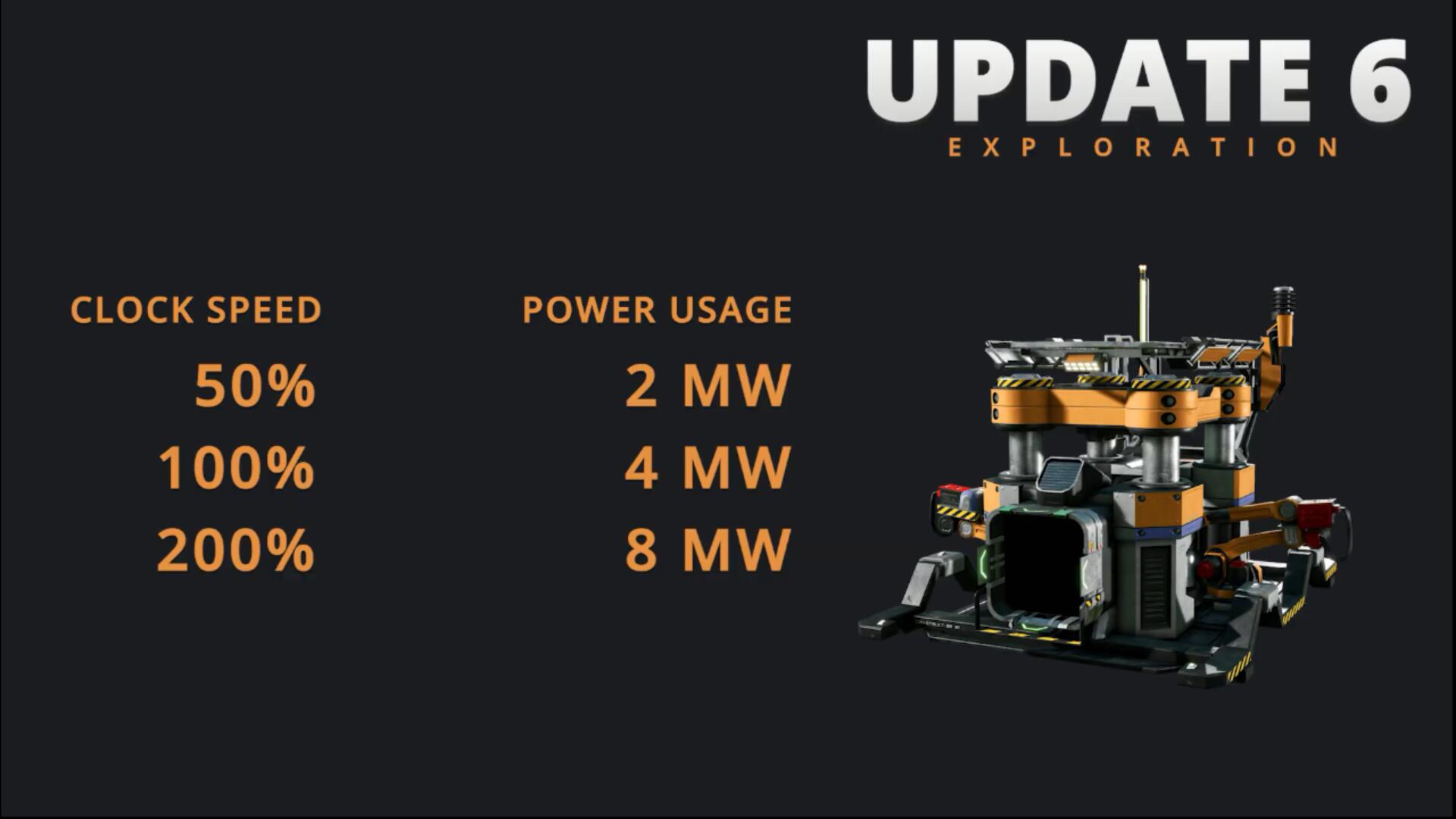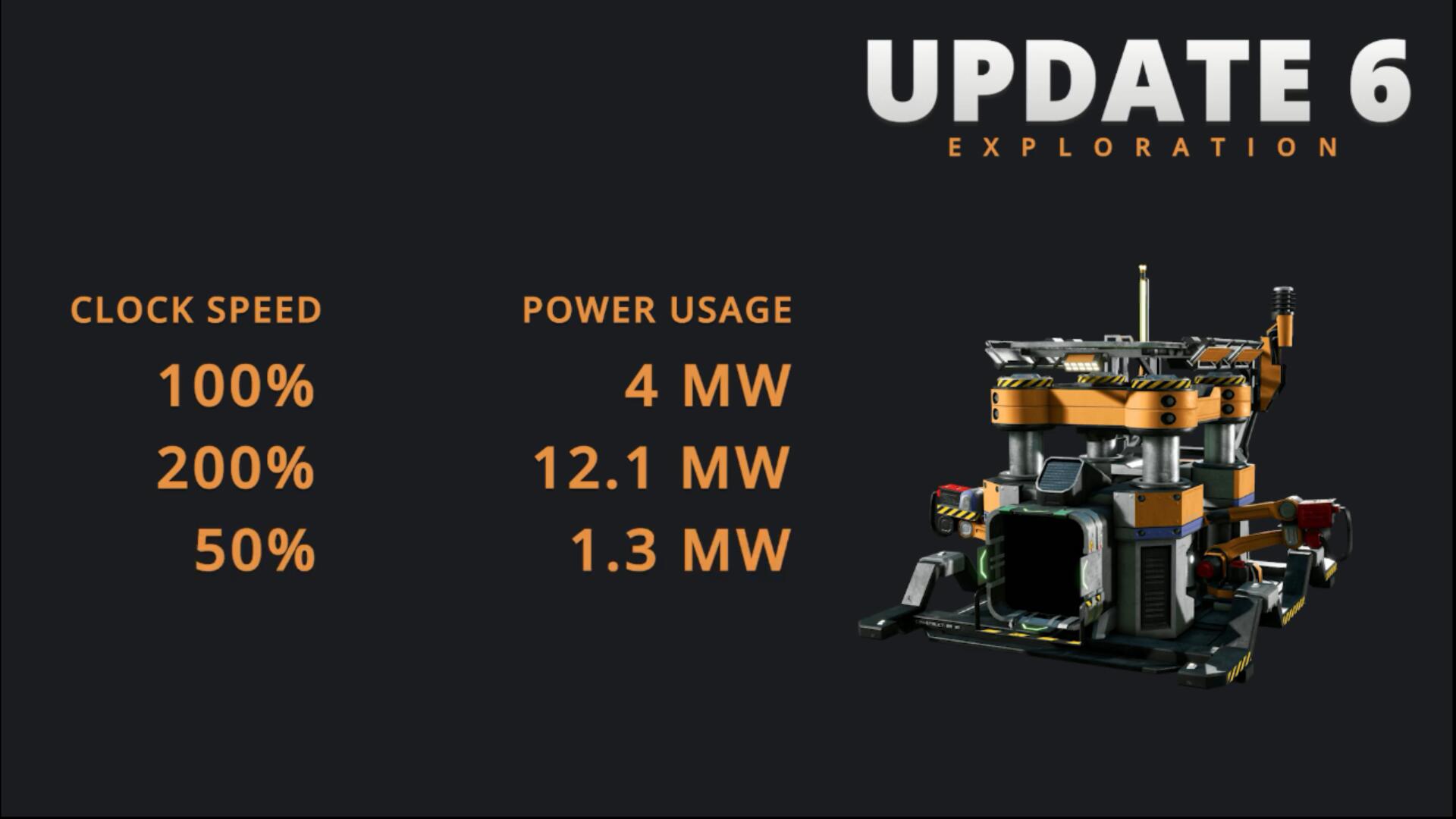 此外,制作组还将对机器超频进行重新调整,功率需求在未来将会变为线性形式,也就是说,一台超频至200%的机器只需要使用两倍的功率,降频亦然。这意味着他们正在考虑加强超频、削弱降频。这可以让玩家更容易通过超频来改进工厂,对于游戏后期的玩家来说,也能建造更大、更高效的工厂。不过目前,制作组还不完全确定是否会做出这种改变,需要再听一听玩家社区的反馈意见。