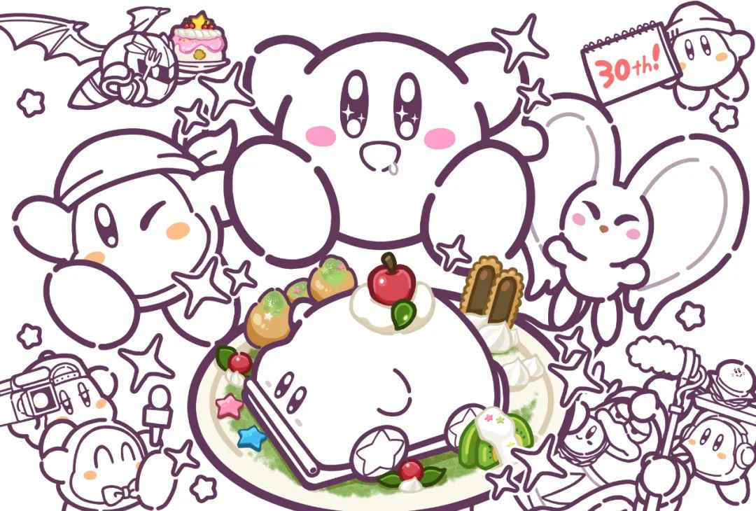 日前发布的星之卡比30周年插画,今日公布了一张未上色版,可以自行涂色。