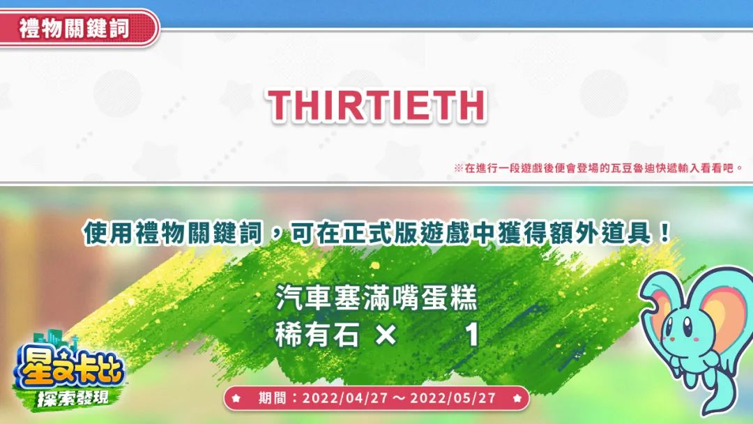《星之卡比 探索发现》礼物关键词“THIRIETH”(卡比30周年纪念),使用可以获得稀有石道具。