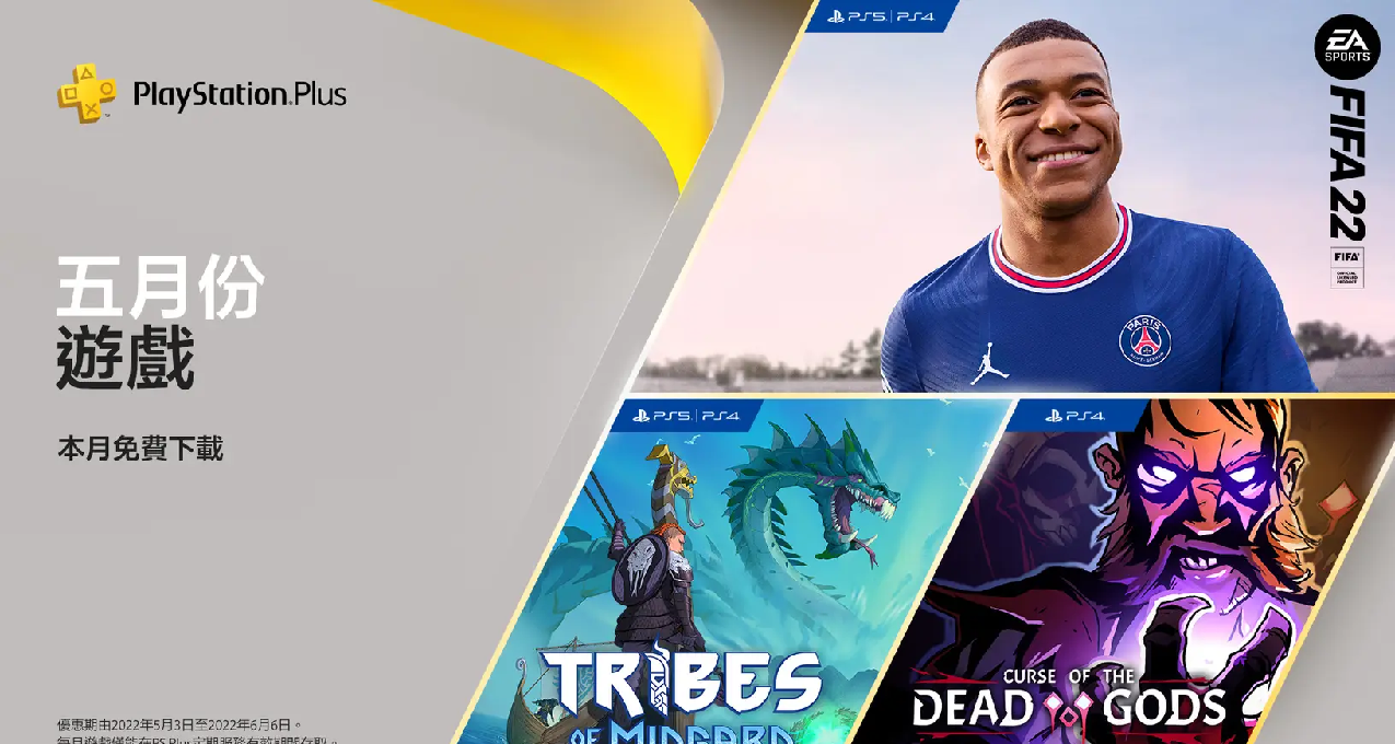 2022年5月港服PS+会免游戏阵容正式公布!PS5/PS4 《FIFA 22》、PS5/PS4《米德加尔的部落》、PS4《无间冥寺》。领取时间为5月3日至6月6日之间。
