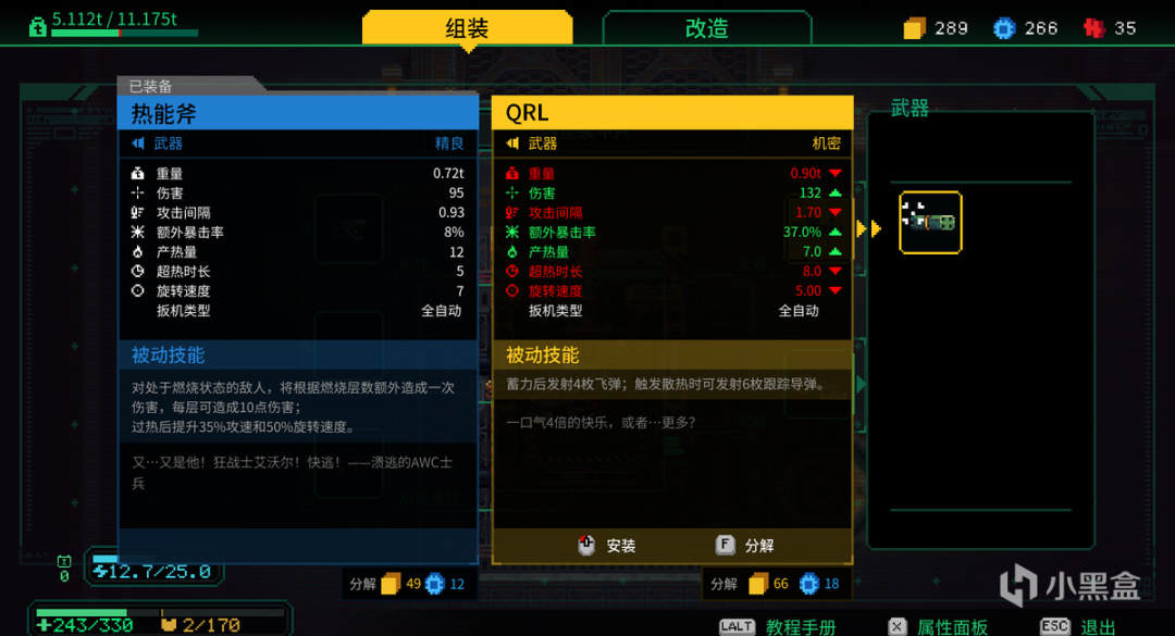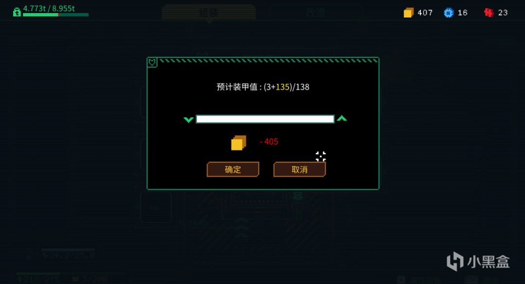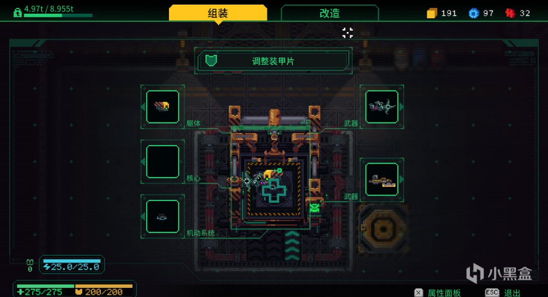 「商店」里玩家可以优先选择一些身体部件以及近战武器以保生存能力,不必强求远程武器。后期如果金币较多则可包圆装备然再分解获得蓝色素材,用来改造机甲。