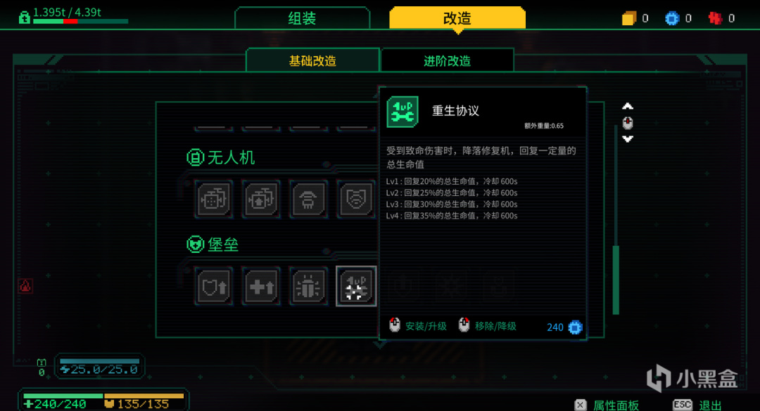 上文中提到的各类系统都是在基地界面进行的操作,而「基础改造」和「进阶改造」则是在关卡中使用装配台进行的机甲属性提升。只要通过消耗蓝色素材就能升级和安装相应的改造能力,所以早期阶段依旧是推荐优先以生存向的堡垒属性为核心,后期再进行调整安排。