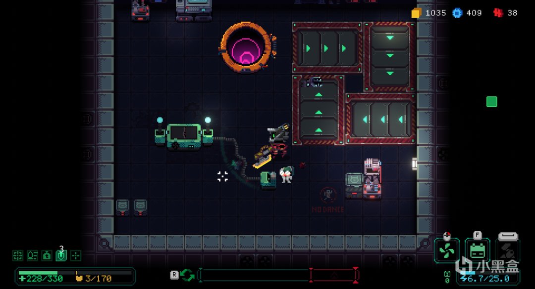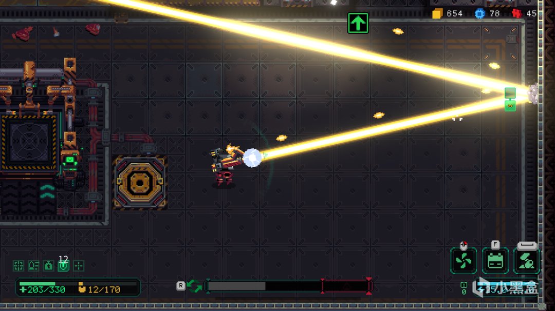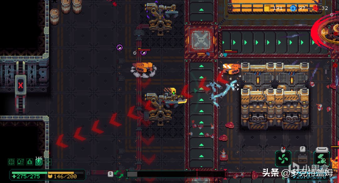 本作中主角通过「血量」「装甲片」「电力」等能源进行驱动,而不同能源之间也起到了不一样的效果。电力为可再生能源,用于助动,而其他两项则理解为护甲与生命值(初始不可再生),可在装配台通过消耗黄色素材进行兑换(后期黄色素材太多,建议挑战难度高的地图之前先补充装甲值)。