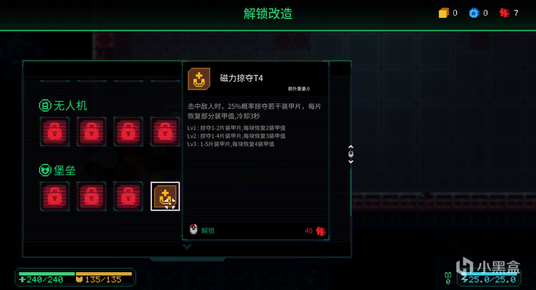「解锁改造」和「解锁装备」可以帮助玩家在游戏中获取到更强力的改造属性及装备,只不过由于红色素材需求较高,早期开荒阶段还是推荐优先加点生存能力。