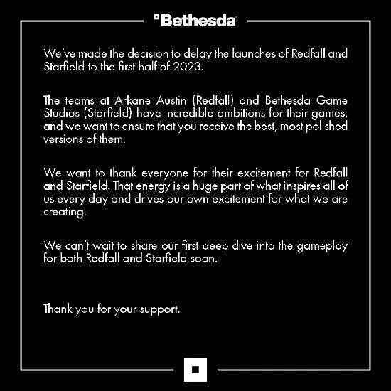 我们已决定将《星空》和《猩红陷落》的发售日期推迟到2023年上半年。