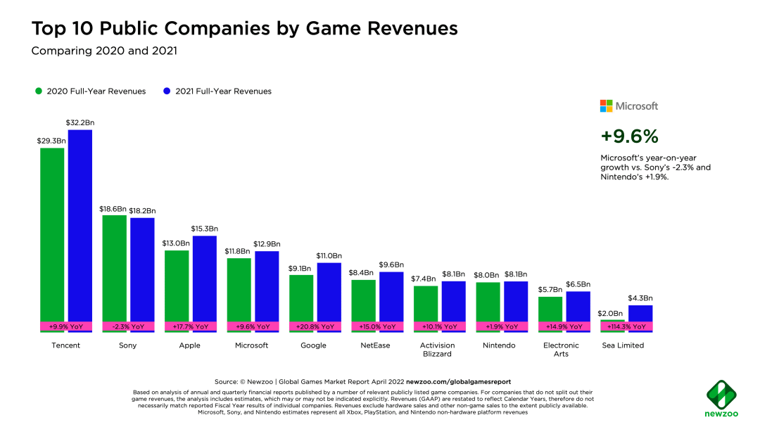 近日国外调研公司Newzoo发布了新的报告,报告对比了全球十大游戏公司2020全年和2021全年的收入。