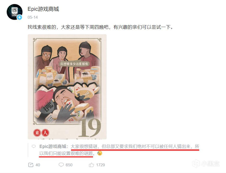 关于这次的“神秘喜加一”其实这次Epic官方是提供了线索的,他们表示:“大家很想猜谜,但总部又要求我们绝对不可以被任何人猜出来,所以我们只能设置很难的谜题。”于是Epic国内账号发布了一张图片,关于本周神秘游戏的线索就藏在其中。