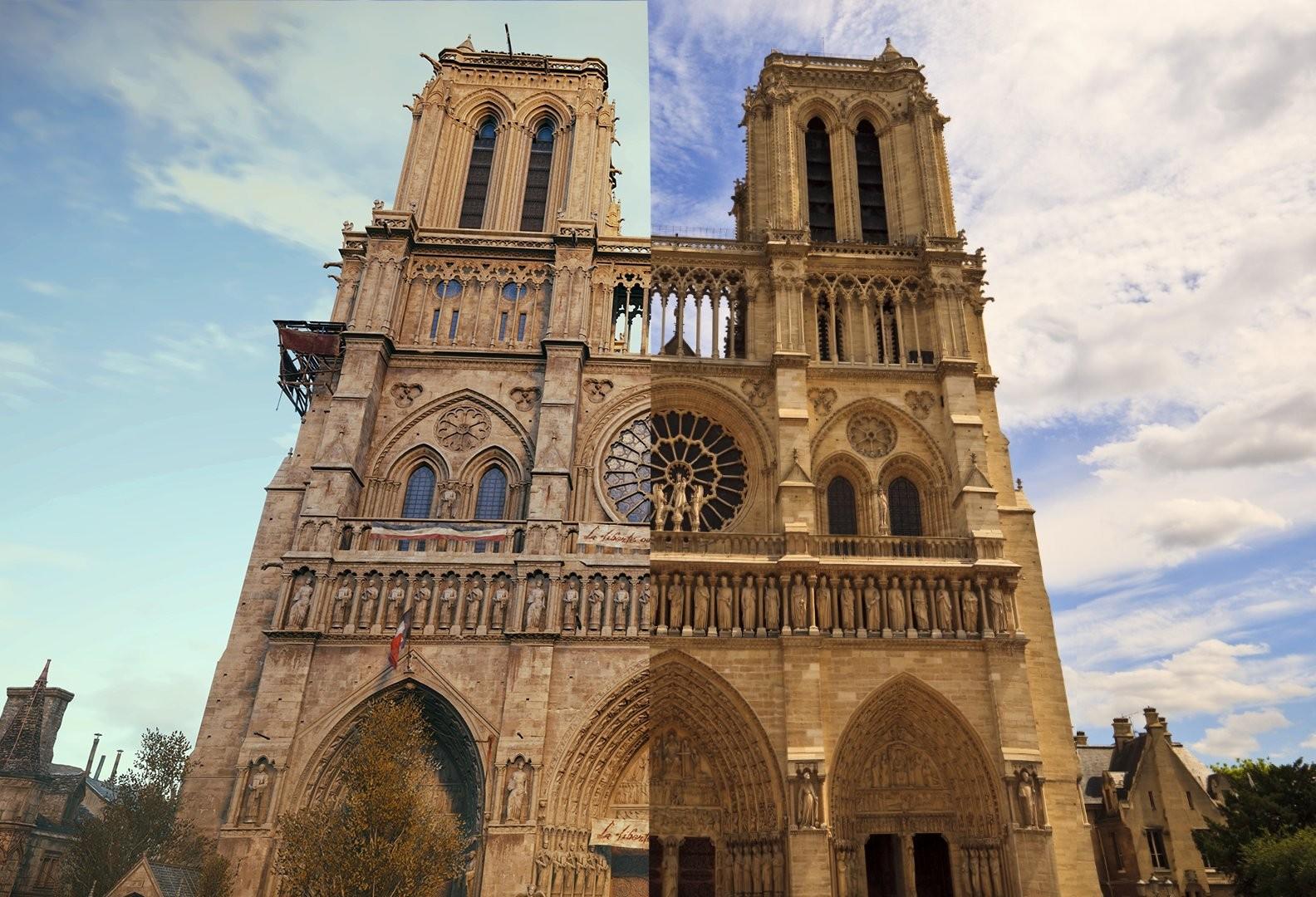 育碧发布了一张现实世界和《刺客信条:大革命》游戏中巴黎圣母院的对比图,玩家们能看出哪边是游戏哪边是现实吗?