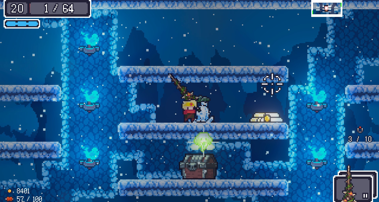 说说游戏内容本身,游戏里的怪物都是不会被打断攻击的,所以必须了解每个怪物的招式才行,如果一下没杀死,马上就得考虑怎么躲避,不过好在冲刺技能cd很快,熟练了之后冲刺避开很顺畅。而且游戏里给玩家的奖励是很丰厚的,几乎每一个房间都有宝箱!开宝箱就是很开心啊啊啊。道具种类也很丰富,虽然道具栏有限,但是只要同时拥有套装里的几个道具,就可以获得套装效果获得增益,还可以在合成器那里合成更好的装备。