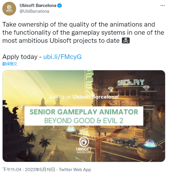 育碧的《超越善恶2》实在太难产了,07年就曝出开发续作,17年E3正式公布。如今这款游戏的开发进度依旧不如人意,让人感觉它似乎是一款永远也不会发行的游戏。育碧巴塞罗那工作室目前正在寻找一名高级游戏动画师参与该项目的开发。育碧上周在推特上发布了该职位的招聘公告,“在育碧迄今为止最具野心的项目中,全权掌控动画质量和游戏系统功能。”