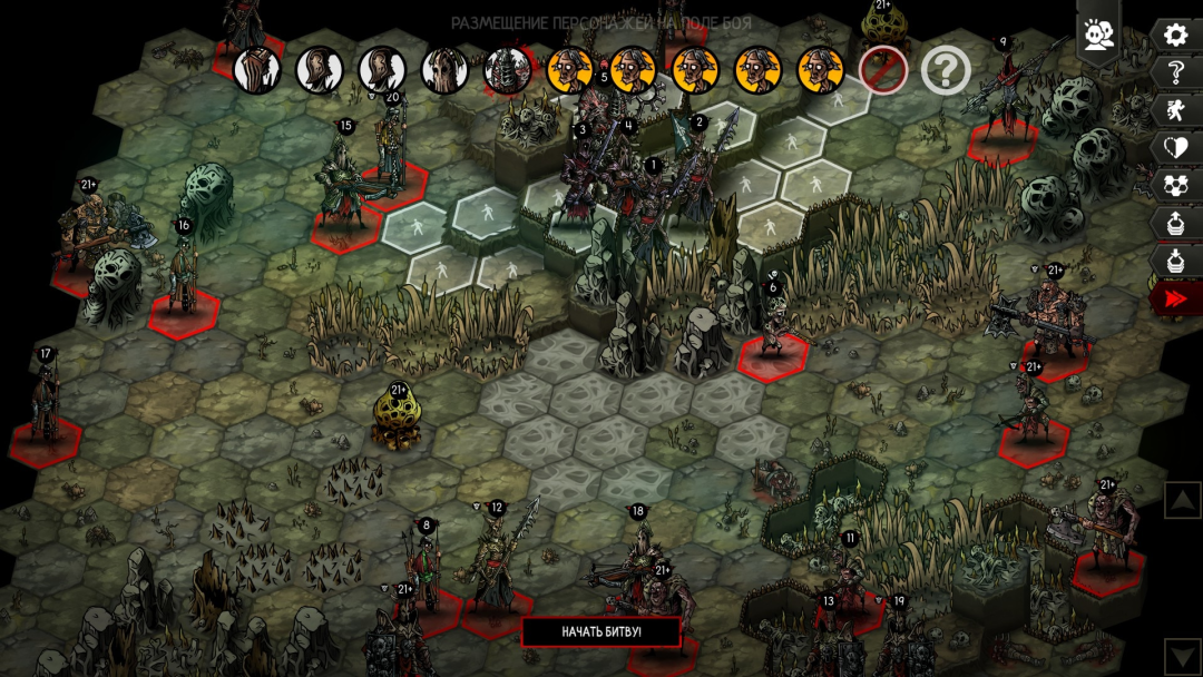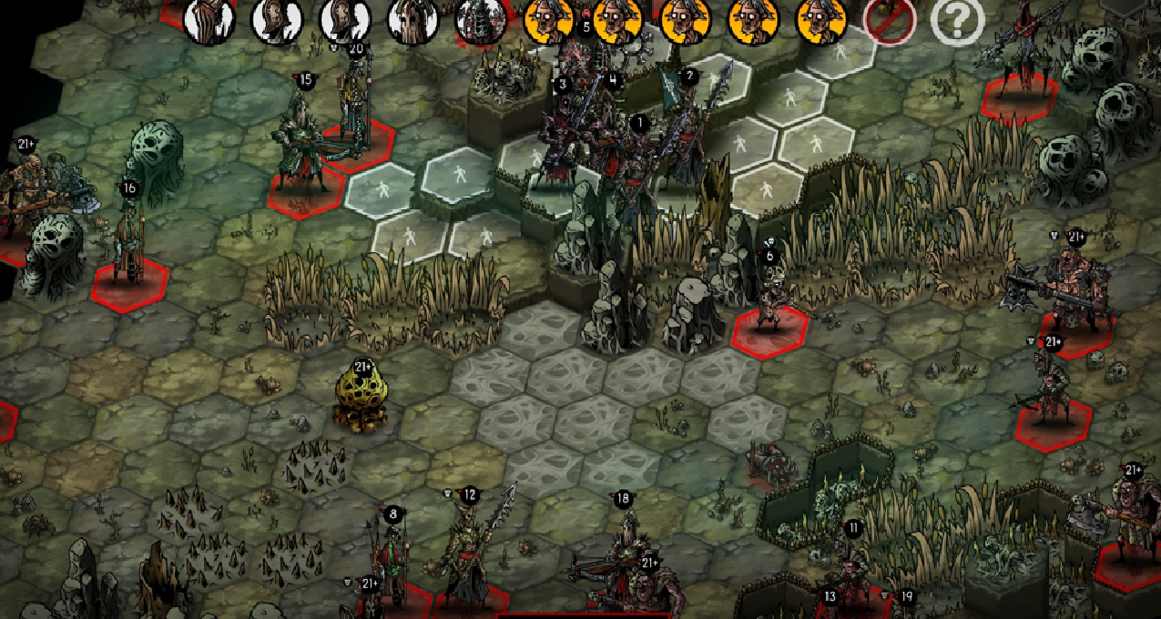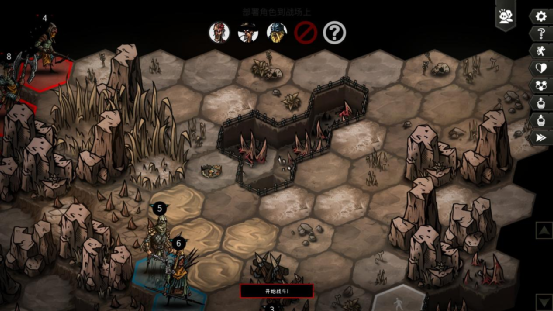 一切准备就绪,接下来就准备策略方面了。游戏采用常见的六边形格子,格子有高低与地形差异。高对低有伤害加成,并且地形相差为2时,近战类就不可攻击。地形也十分重要,既存在减少远程伤害的草丛,也存在减少速度的泥潭,并且还有即死的地刺存在。