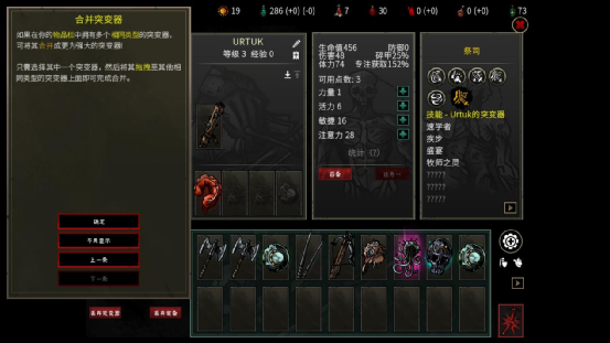 突变器分为两种,特性与专注能力,可以放入突变器栏,达成条件后,单位还可以永久吸收突变器变成永久特性。突变器是游戏的核心机制,特性相当于被动技能,而专注能力就是主动技能,且只有一个。因此,多个特性的搭配至关重要。比如快速反应+加速暴击+敏锐目光,高速度让你的回合不断提前。