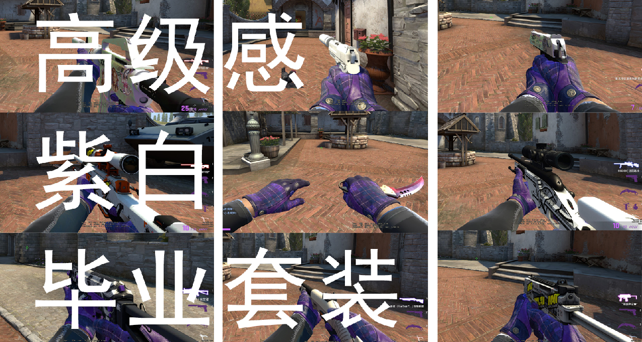 作为一个低端皮肤玩家(枪法上不去那能咋办嘛),玩皮肤有一段时间了。发现主流推荐的同色系(邻近色)、同迷彩系,以个人的审美比较容易看厌。经过一轮又一轮的手续费上交之后,本着一颗又要闷骚又要性价比的心,根据色彩搭配原理,搞出了一套个人比较满意的紫白色系的毕业套搭配。