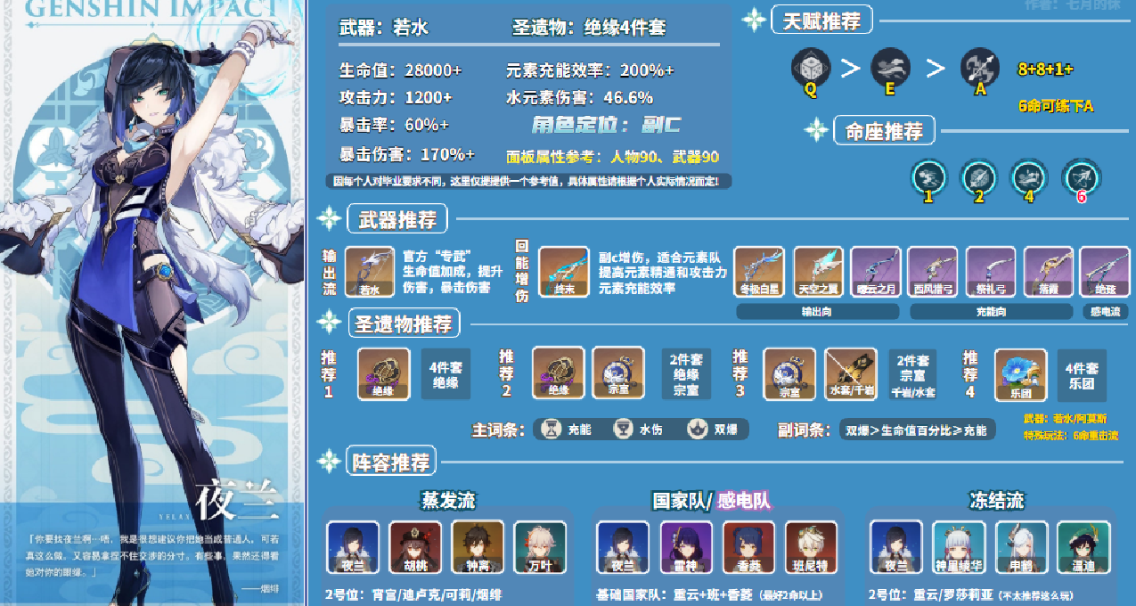 hello~大家好,这里是”七休“呀,夜兰up有一段时间了,so...这是一篇迟到的「夜兰」的天赋、命座、圣遗物、武器、阵容搭配细致且全面的培养攻略!