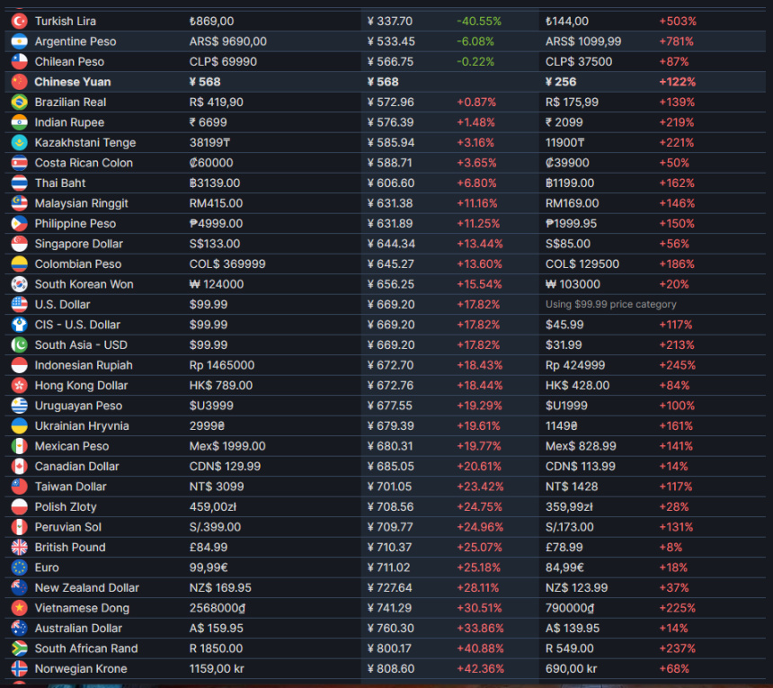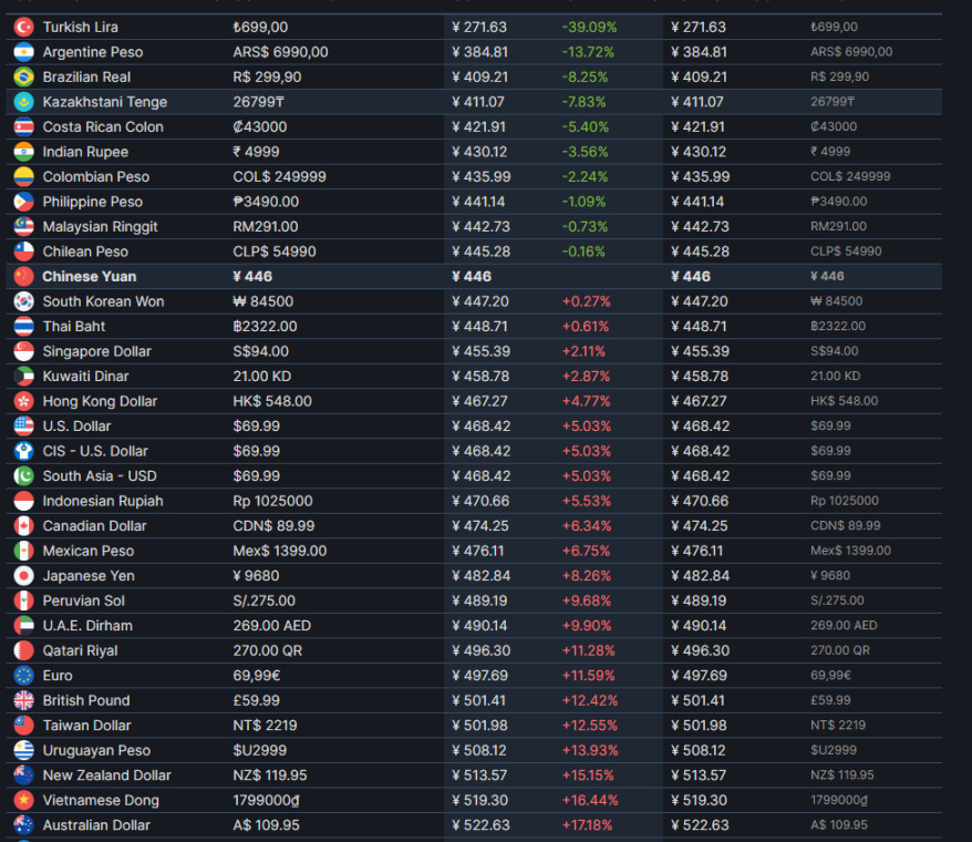 先来看一下steam的各区售价以及战网的各区售价。
