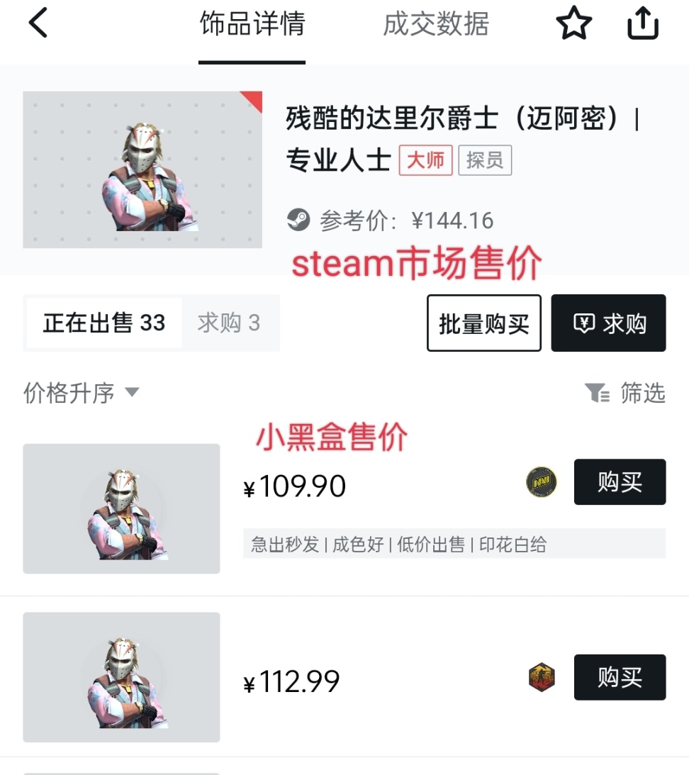 此方法就是在小黑盒上面购买饰品,然后卖出,如图所示,该饰品的buff售价为100rmb折合里拉260,在完成交易之后,就可以直接放到steam市场上售卖到160rmb,除去15%的市场手续费,等于你使用了100块钱就买到了136的余额。