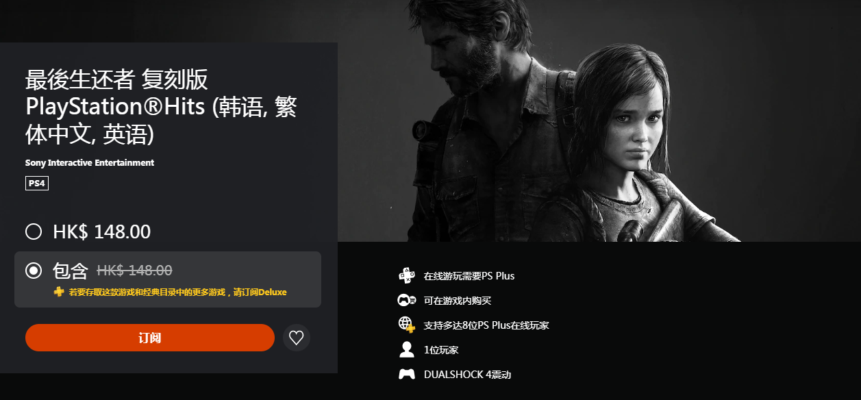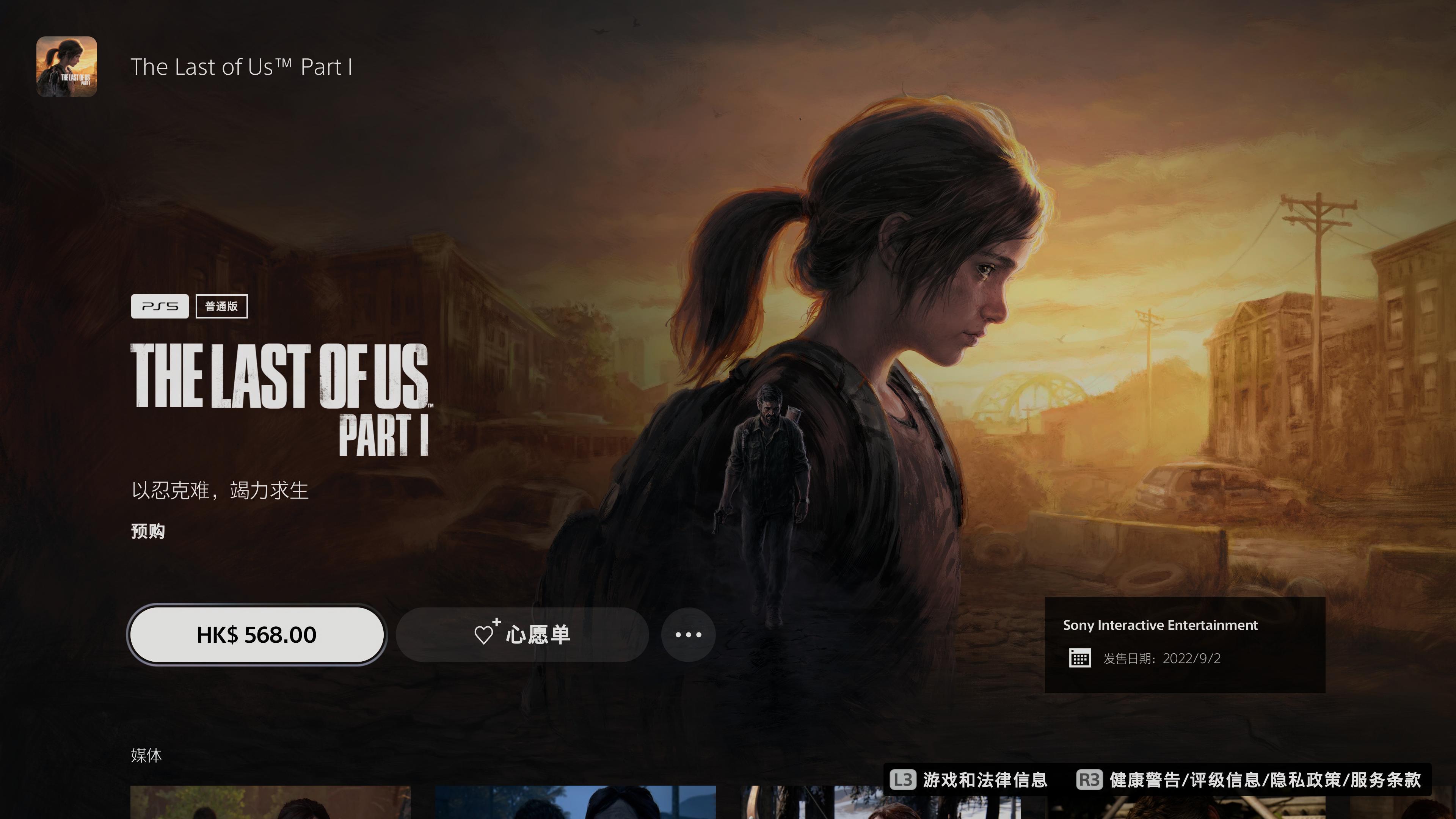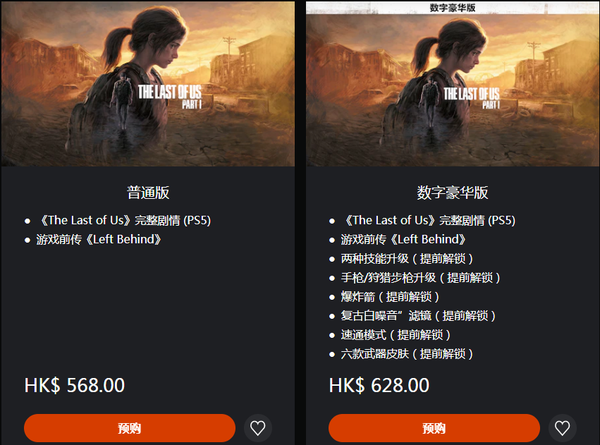 《最后生还者 重制版》(又名美国末日)已上架PS Store并开放预购,新增简体中文,9月2日正式解锁。普通版售价为568港元,豪华版售价为628港元,预购特典为补充品奖励和武器零件奖励。