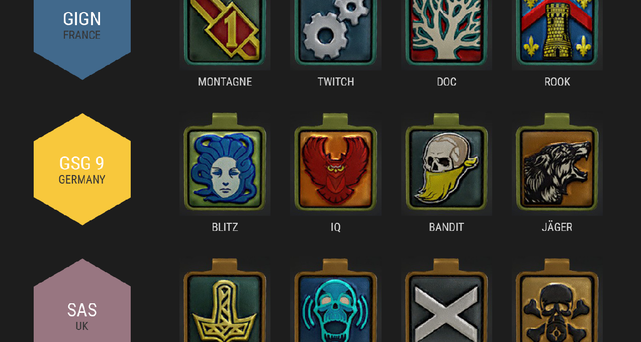 (编辑:感谢评论中@不吃瘪骑士、@御狐神双炽、@快乐的烂弟弟、@电线杆菌几位朋友提出的猜想,这个设计极有可能同大盾的原型人物有关,是曾经参加了飞机劫持案的一位GIGN军官,带头第一个推进阵线,身中数枪也没有停下脚步,图标中的1或为原型人物的率先突入,也指大盾这一角色在游戏中应承担的队形位置。另外这个红金配色的图形可能是法国荣誉军团勋章一等功的大十字勋章的授勋者会佩戴的缎带,不过目前证据不足。如果有了解法国勋章等级相关知识以及大盾原型人物真实授勋等级等历史资料的朋友还请多指教~)